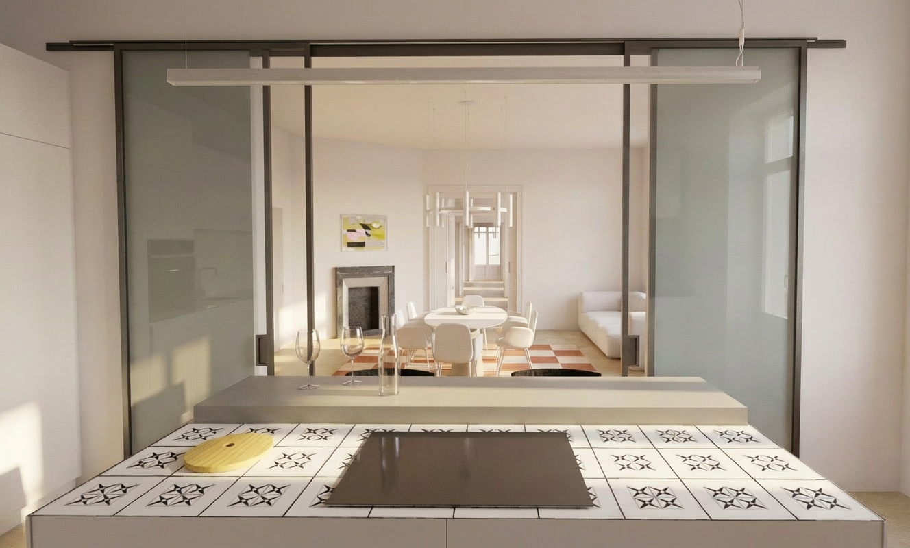 tavolo con piano in marmo calacatta e piede grigio sedie con gambe in metallo scuro e rivestimento tessuto beige divano in tessuto beige
