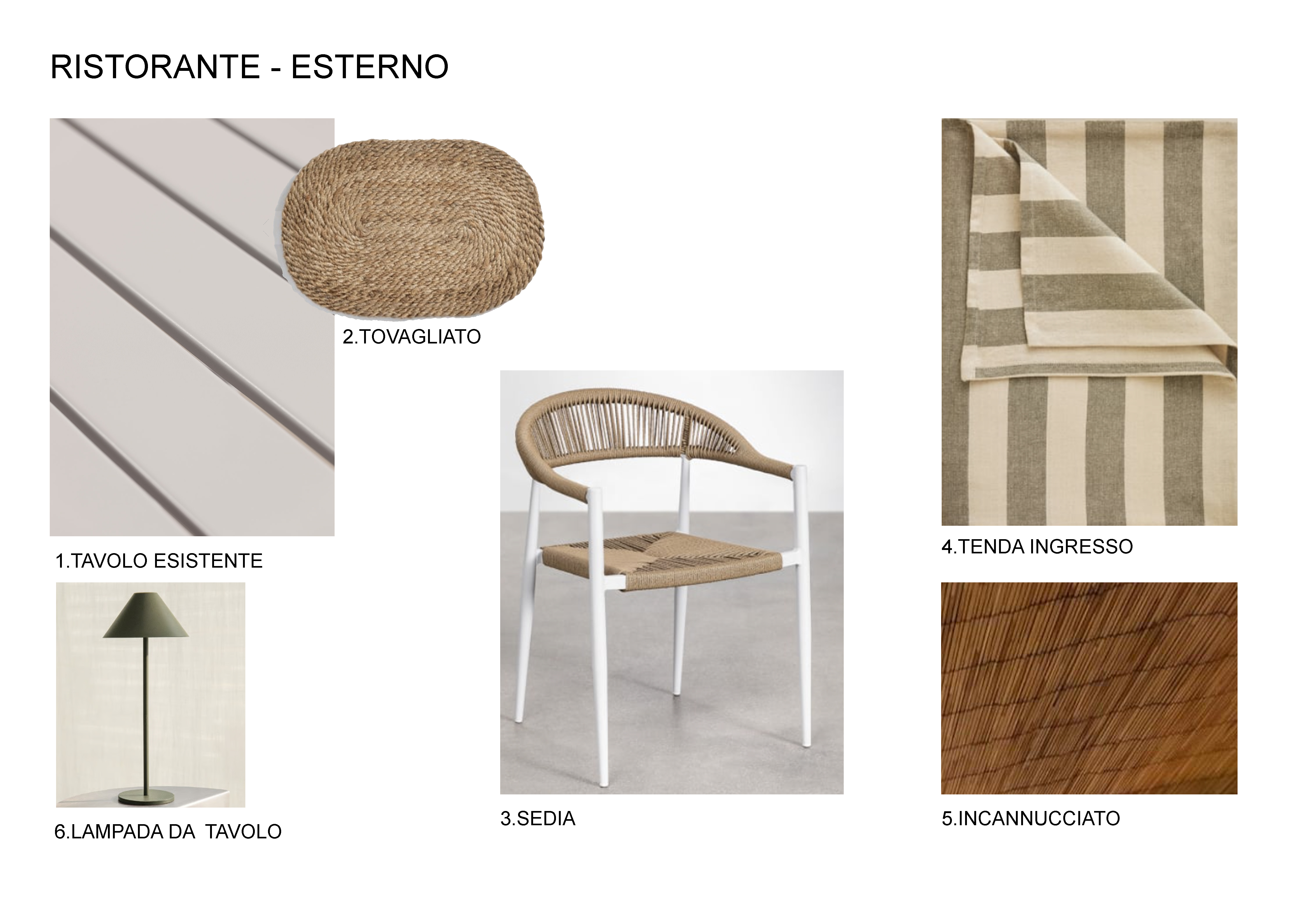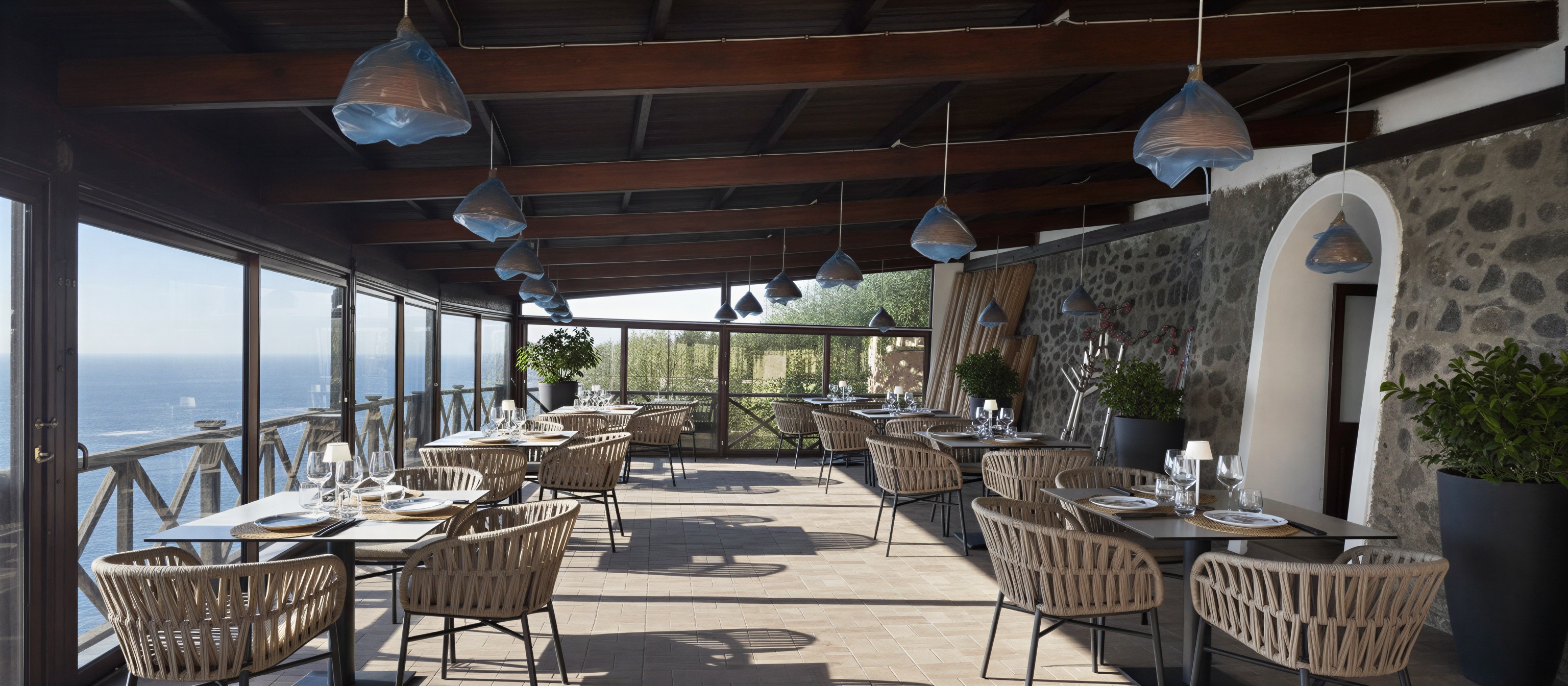 exterior shot hotorealistic 3d render of an elegant restaurant with an outdoor terrace the space features armchair style chairs made of woven rope in green and sand colors paired with square tables with white bases and oak wood tabletops white painted wooden ceiling beams add warmth and character to the space bright natural daylight soft shadows realistic global illumination high detail materials and textures modern mediterranean atmosphere clean and refined design wide angle view ultra realistic 4k 8k resolution professional architectural visualization