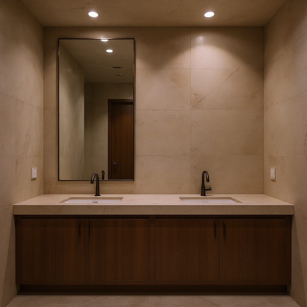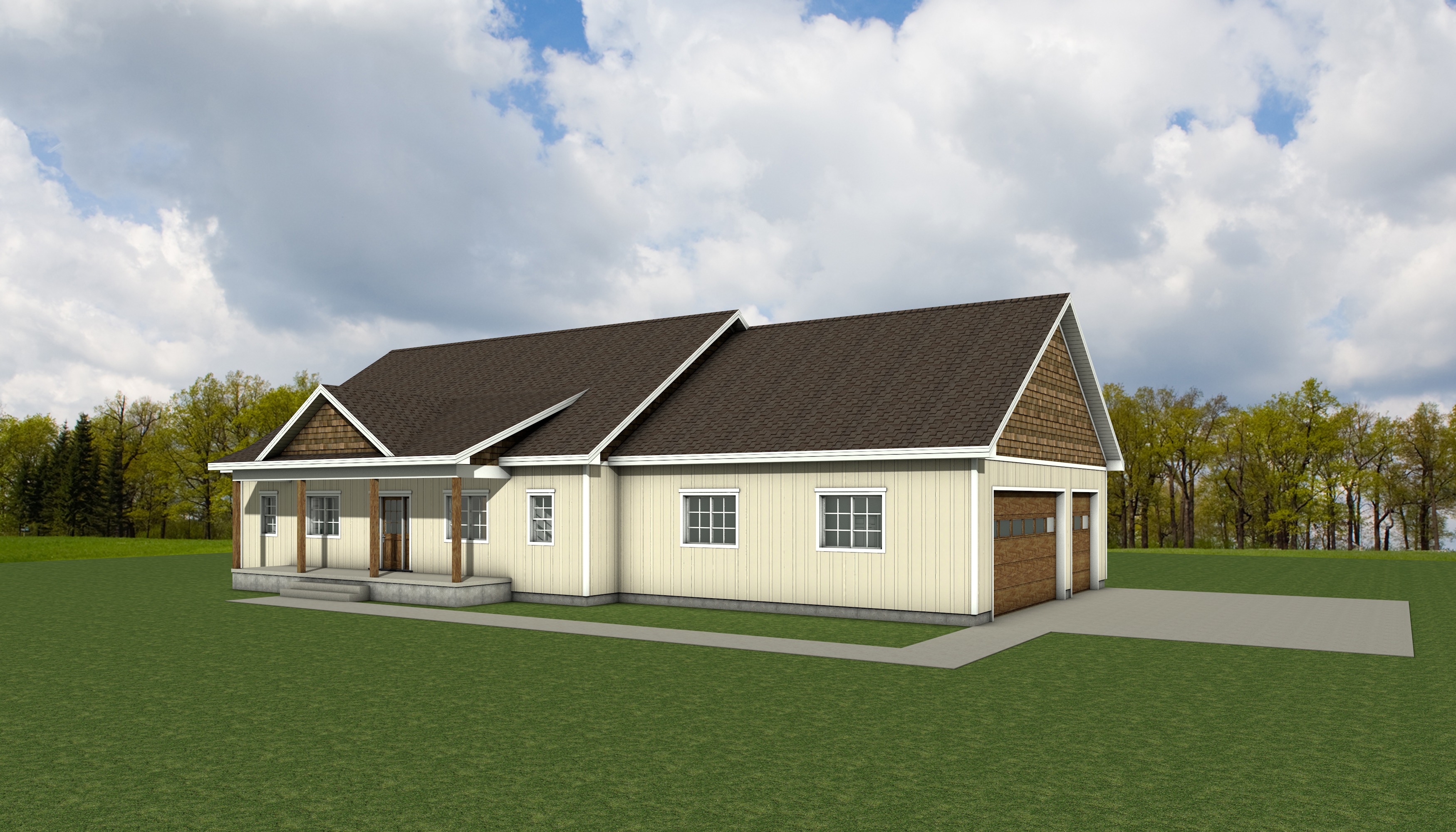 a modern house retain the exact structure colors and window arrangement rooflines siding foundation height and proportions exactly as shown in the reference image integrate into the terrain there is a lush dense forest of mixed hardwoods that are a little further back add cooler afternoon sunlight subtle dappled highlights across the siding and grass create ultra realistic lighting crisp shadows detailed textures in the siding and glass reflections and an overcast sky show only a few lights visible inside render in hyper realistic architectural visualization quality 8k resolution add a driveway tying into the concrete garage door apron make it the summer season