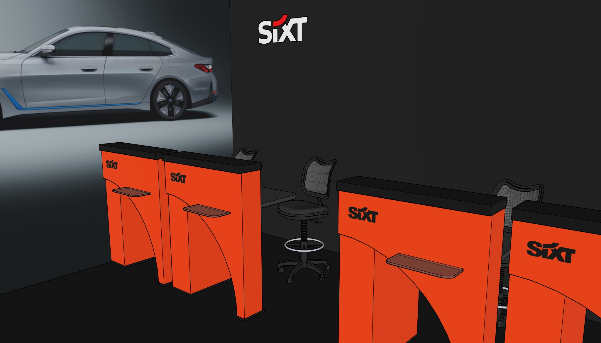 create a sleek modern car rental desk environment the counters should be a vibrant orange with black accents featuring a logo add ergonomic black office chairs behind the counters the background should be a matte charcoal gray with a luxury silver car partially visible to the side subtly spotlighted to create an inviting and professional atmosphere ensure the overall ambiance exudes elegance and efficiency with a focus on clean lines and modern design