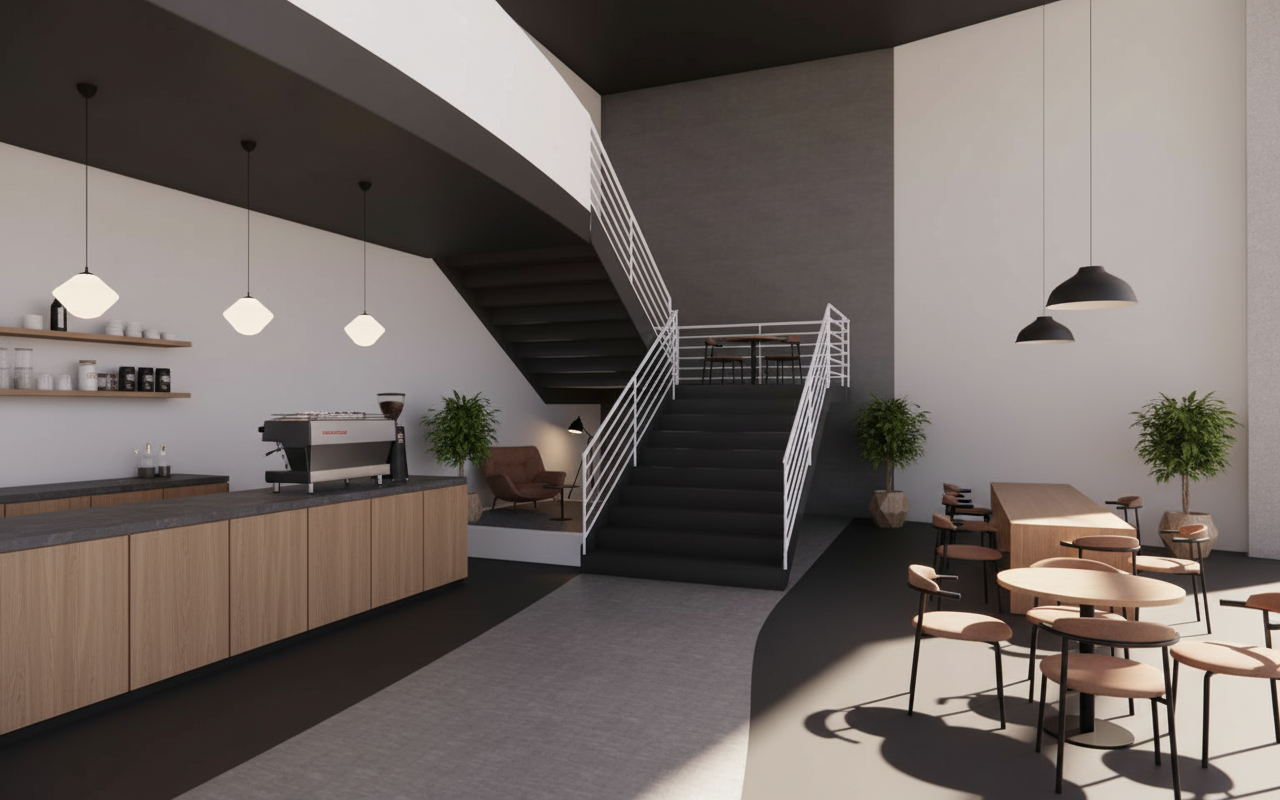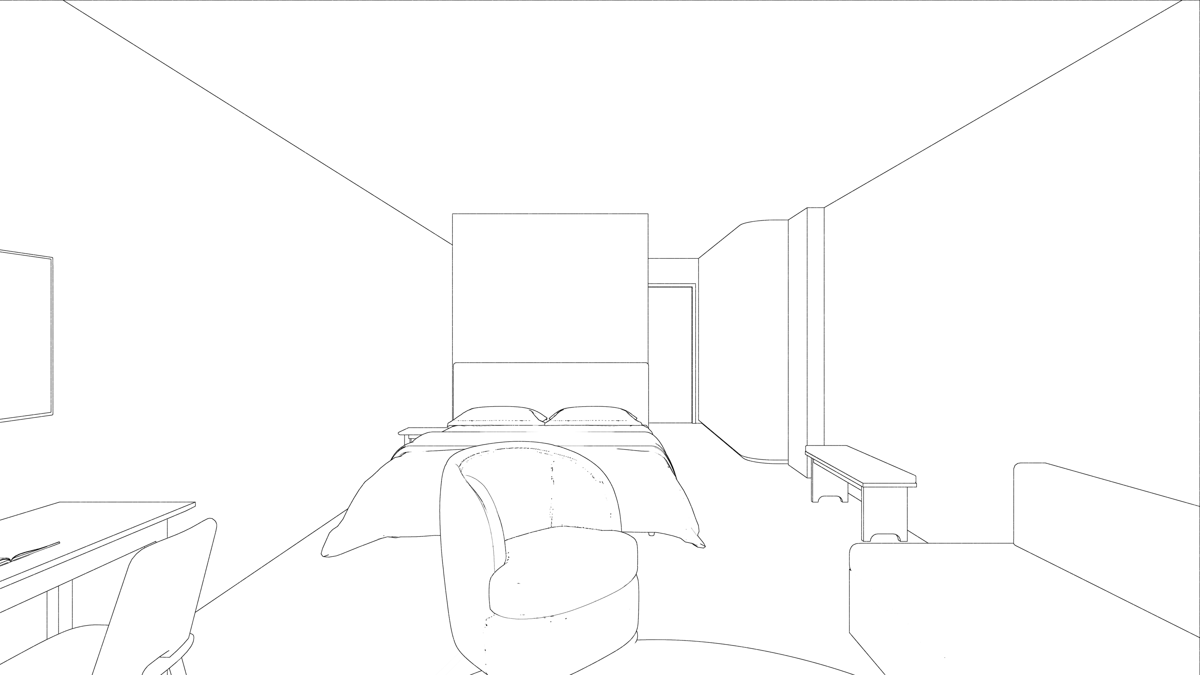 interior shot la stanza di un albergo dove a sinistra del letto presente un vetro trasparente e dietro il bagno la testata letto in legno ed il letto imbottito con tessuto in velluto verde la poltrona centrale ha un tessuto boucl chiaro