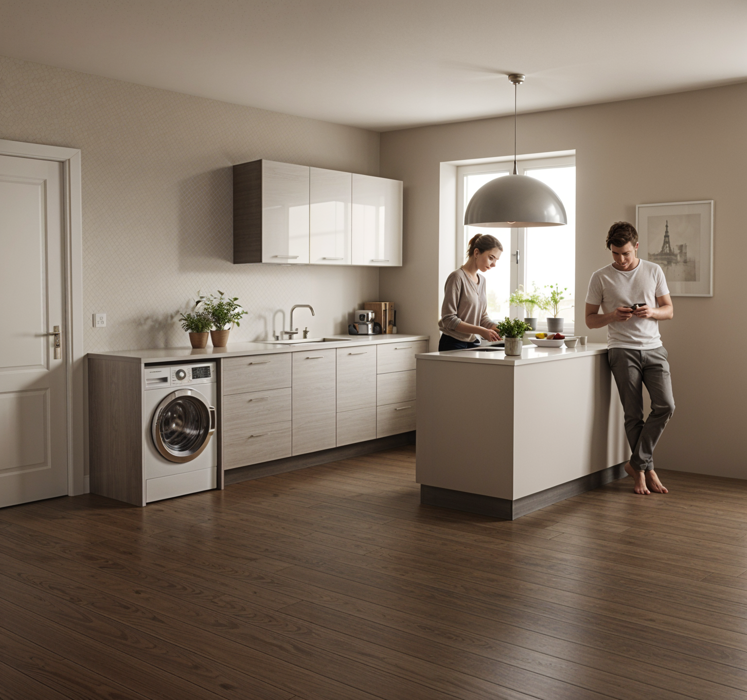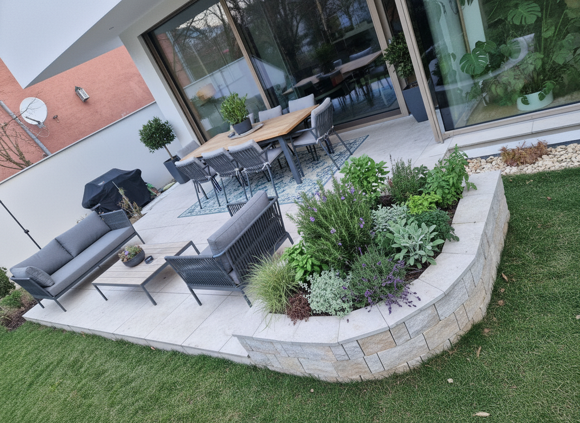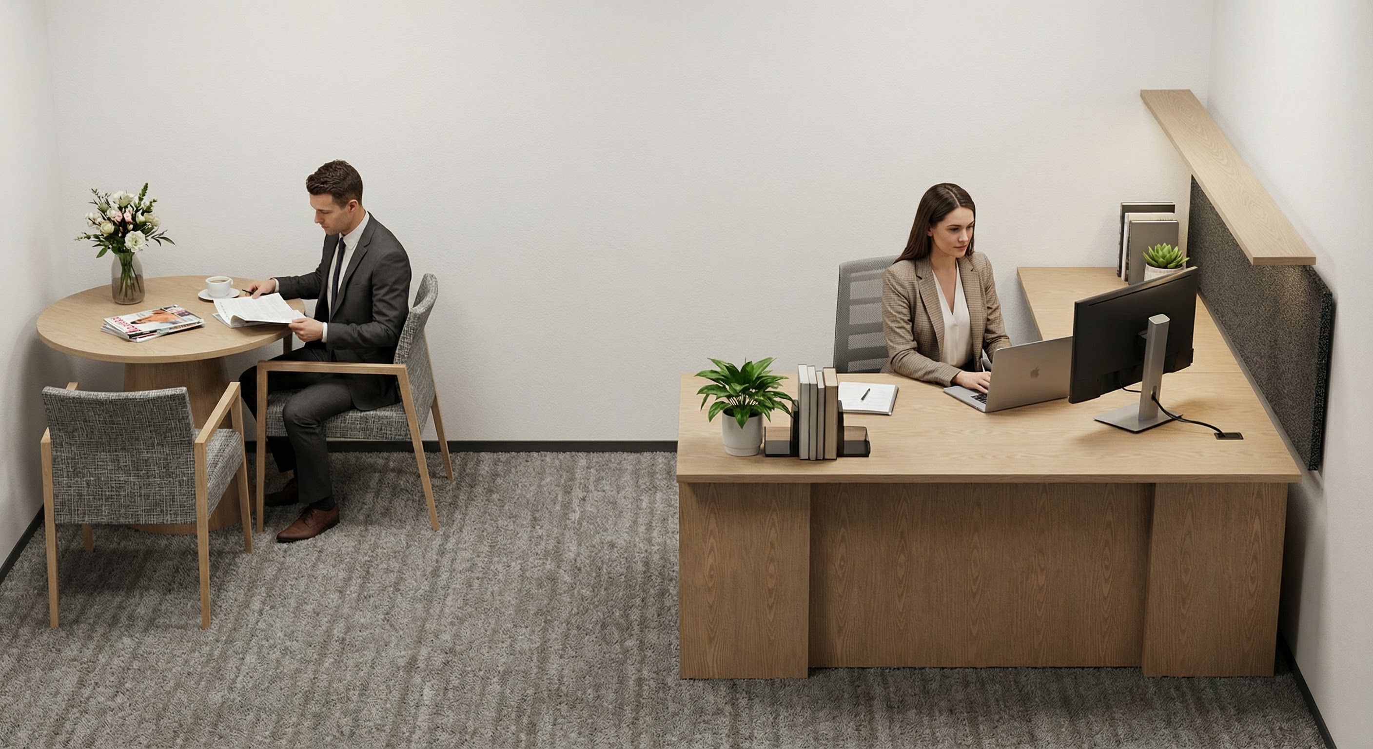 recreate a calm neutral residential living room with the following characteristics warm white painted walls with a smooth matte finish simple white baseboards and minimal trim flat ceiling with subtle crown molding and recessed lighting light natural oak hardwood flooring with wide planks one wall composed of large sliding glass doors bringing in soft daylight bright but diffused natural light with gentle shadows clean uncluttered architectural envelope keep all architectural elements simple and timeless do not add decorative features not described furniture match the design board use the furniture from the design board as the exact style reference rug place the large textured neutral rug from the design board centered in the room it should anchor the seating arrangement and define the conversation zone chairs place the two upholstered lounge chairs from the design board against the wall opposite the sliding doors space evenly and angle slightly inward maintain the exact fabric tone and softness shown in the board two matching ottomans position the pair of patterned ottomans from the design board between the chairs align symmetrically with a small gap large round ottoman place the large round ottoman from the design board centered in front of the chairs and smaller ottomans this acts as the main coffee table element side table add the sculptural dark wood side table from the design board next to the chair on the left desk place the wood desk from the design board on the same wall as the chairs positioned in the right corner match wood tone and detailing exactly table lamp place the table lamp from the design board centered on the desk style mood driven by design board warm transitional aesthetic layered neutral palette emphasis on texture and softness balanced and symmetrical layout calm inviting residential atmosphere the final scene should feel like the design board has been installed into the real room not staged or reimagined rendering direction eye level perspective facing the seating arrangement soft natural daylight as primary light source realistic material rendering accurate scale and spacing