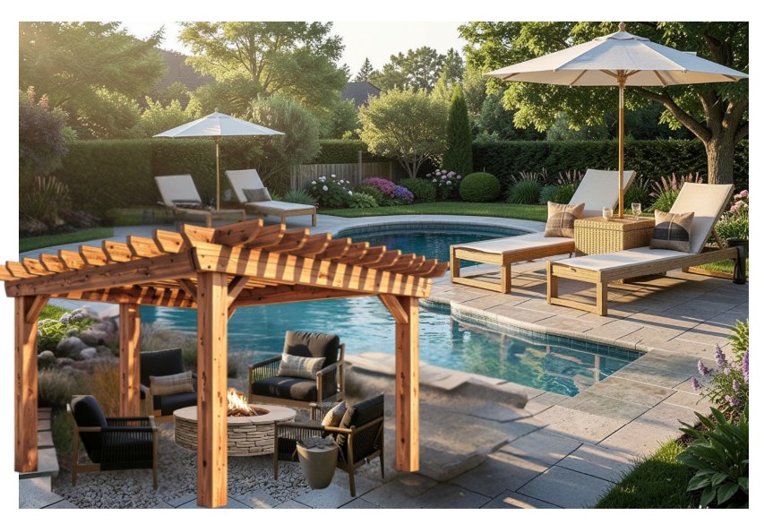 render this outdoor area with the elements shown make the pool curved all the way around like a kidney bean shape adjust the landscaping to feature a european garden feel and include some cypress trees as well show a covered patio from the back of the house on the right