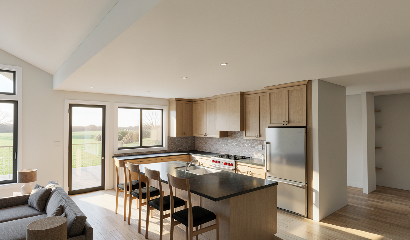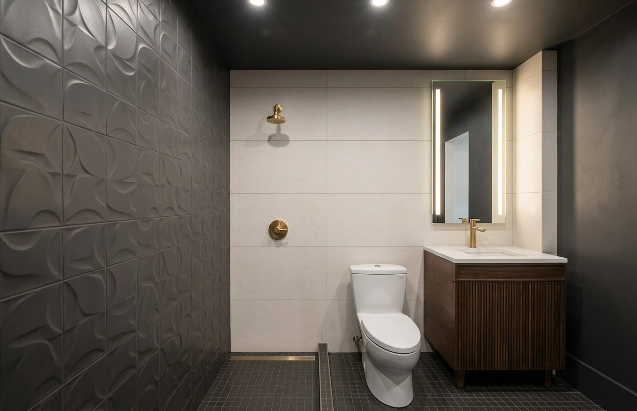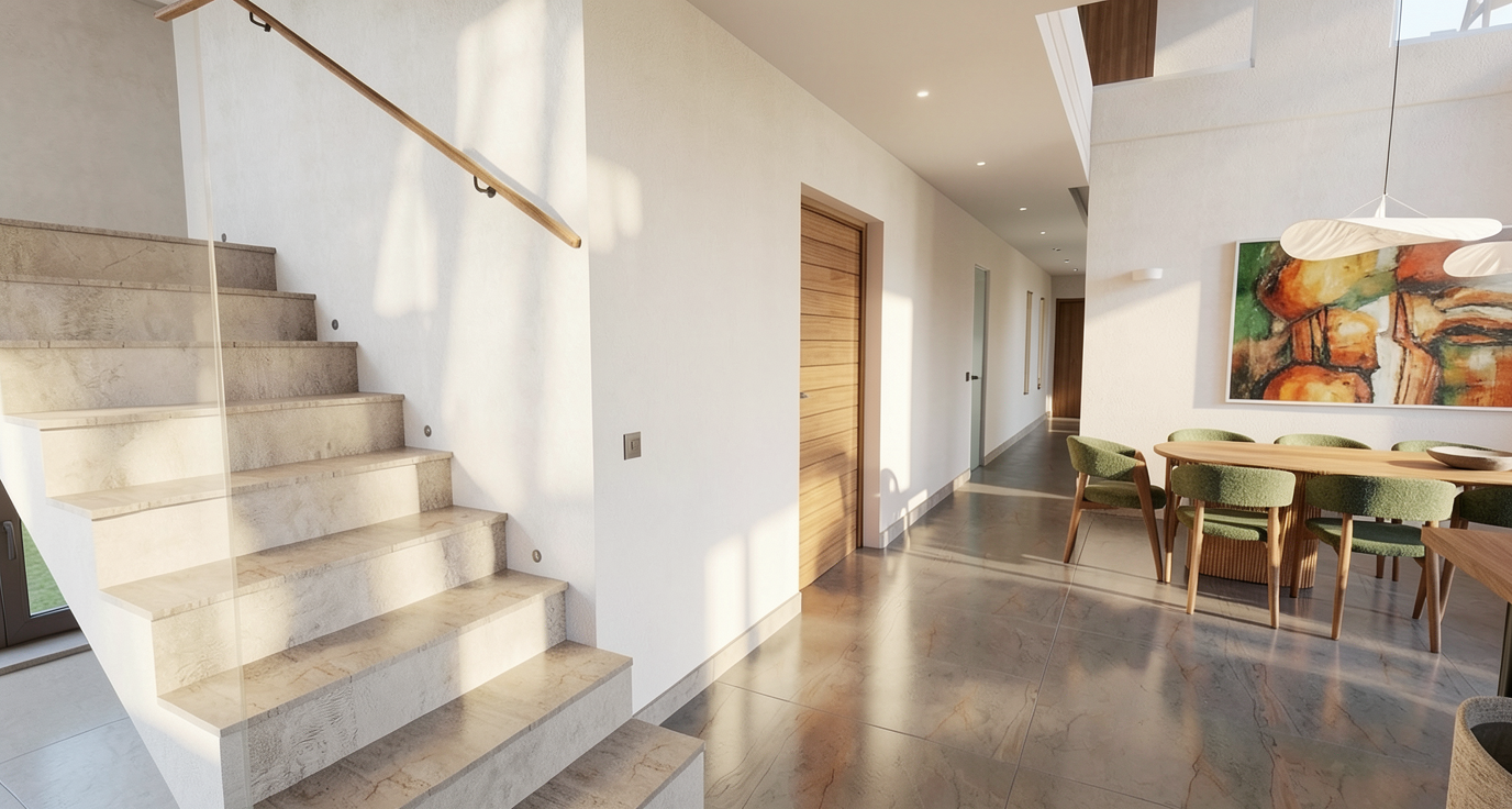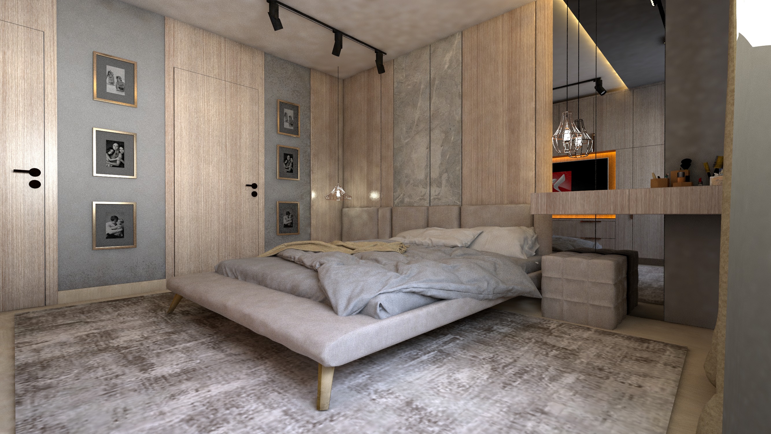 this is an already finished architectural interior render do not change the design layout materials textures or colors preserve the original scene exactly as it is do not redesign the space do not replace materials or introduce new textures respect all original colors and finishes enhance realism only important materials that must remain unchanged dark leather headboard dark leather bench at the foot of the bed corten steel imitation texture on the wall behind the headboard furniture in earthy brown tones harmonize the scene visually while preserving all existing materials improve material realism natural shading and surface depth enhance contact shadows reflections and subtle imperfections natural sunlight entering through windows soft daylight gradients and realistic shadows architectural interior photography style eye level camera 35mm lens depth of field ultra photorealistic render global illumination ray tracing 8k preserve original design enhance realism only no redesign