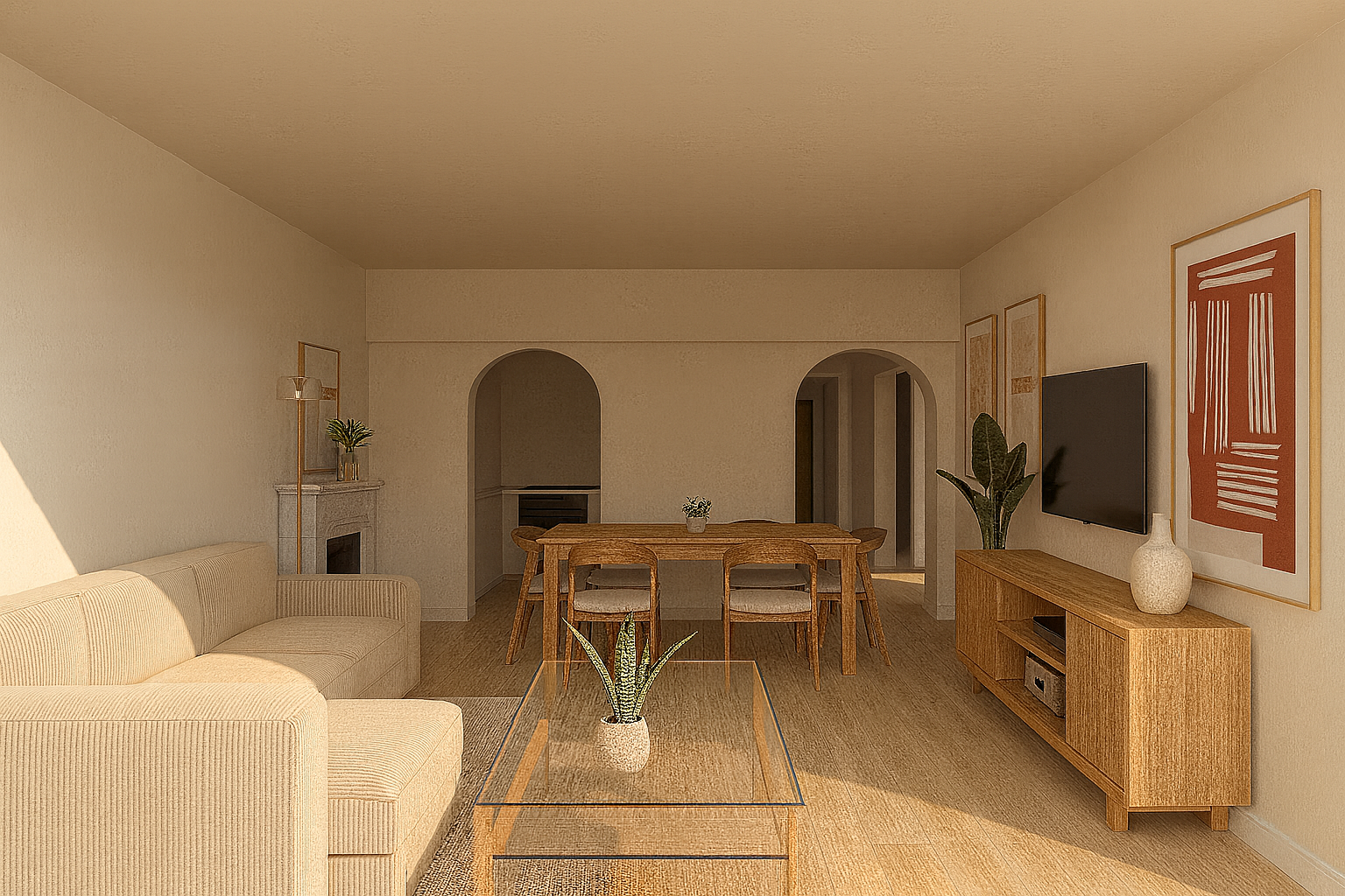 modernist interior shot modern minimalist living room with soft beige walls casting a warm inviting atmosphere the sofa is a light cream color with subtle textures providing a cozy feel the wooden dining table and matching chairs are in oak finish complementing the natural wood tones of the tv stand a glass coffee table with a simple elegant design holds a small green potted plant as a centerpiece large abstract artwork in shades of red and white adorns the wall adding a pop of color soft sunlight filters through unseen windows casting gentle shadows and enhancing the serene ambiance architecture