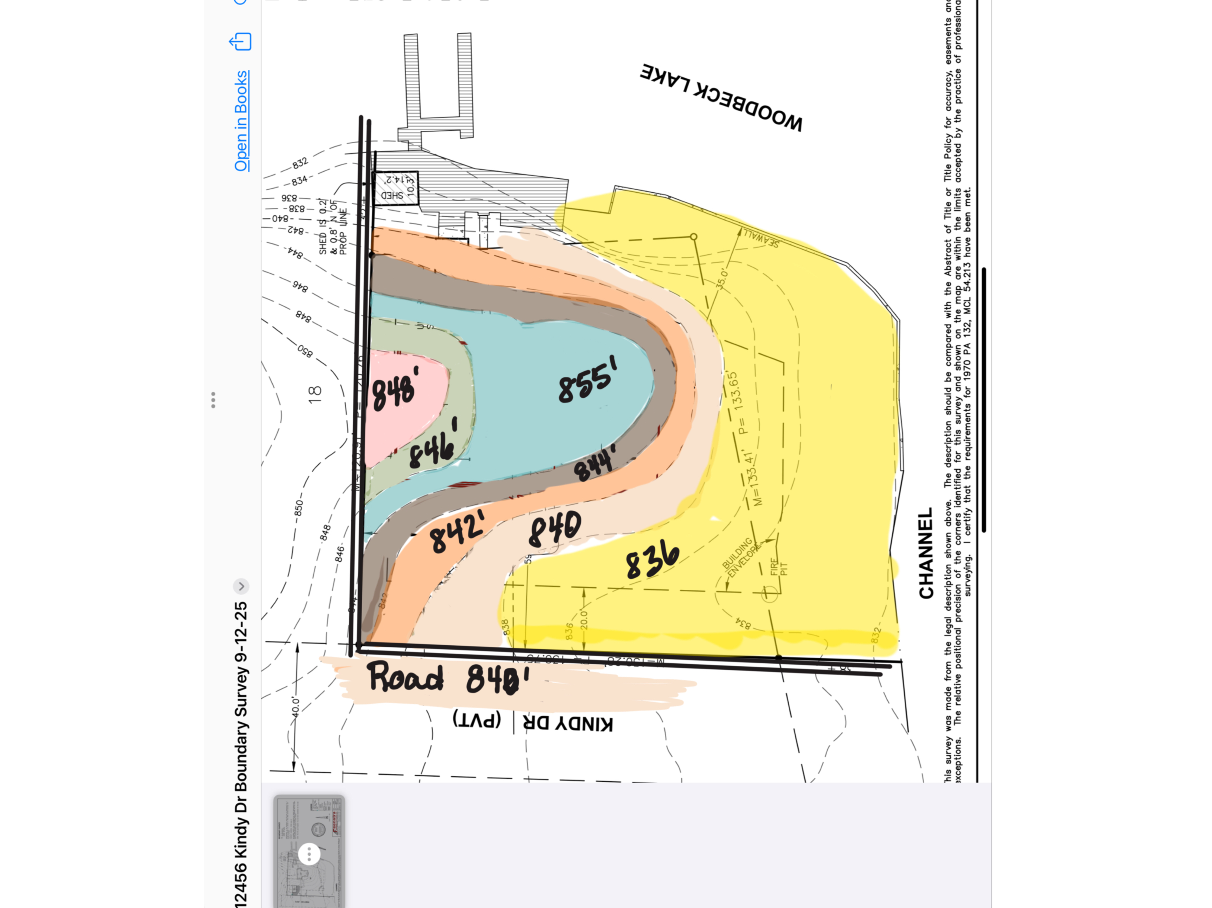 please take this topographical property survey and show me a 3d view of how the property slopes by the colors shown with the dimensions also noted