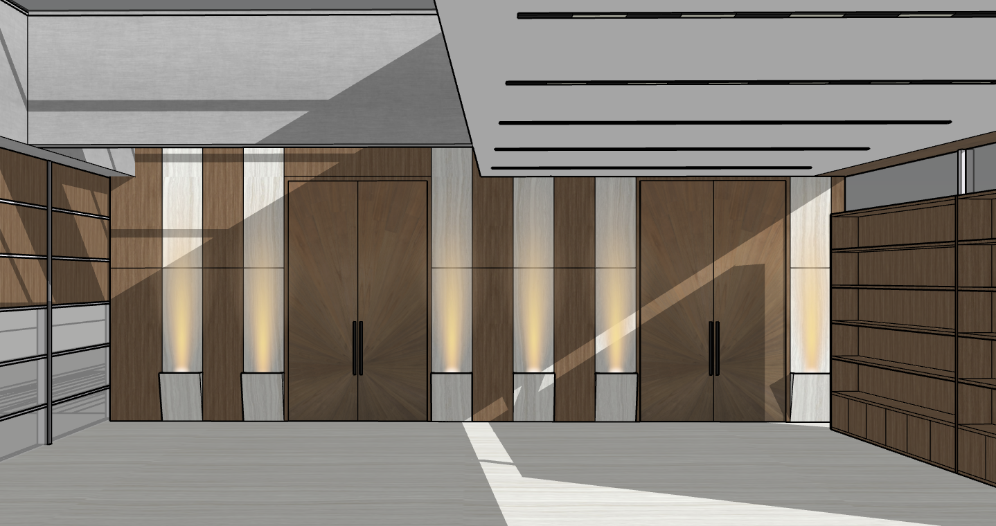 modern interior room with a minimalist aesthetic featuring large wooden panels in warm rich brown tones as a focal element the panels are complemented by sleek vertical stone accents in a soft grey hue the floor is a light grey wood harmonizing with the grey ceiling beams and panels overhead integrated soft ambient lighting emanates from the wall bases casting a warm inviting glow in shades of soft yellow the shelving units also in a matching wood grain add depth and symmetry the overall atmosphere is serene and sophisticated inviting natural light to create dynamic shadows