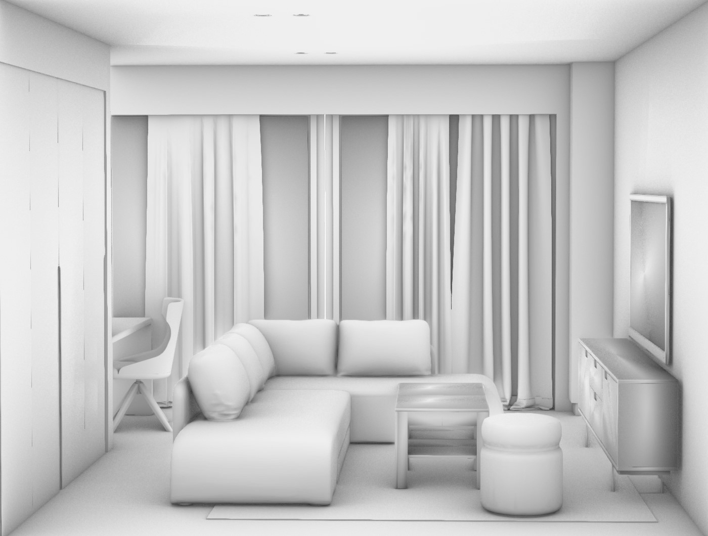 photorealistic interior rendering from a gray clay model apply realistic materials wood stone fabric metal with correct scale and texture mapping soft natural daylight entering the space realistic bounce light warm ambient tones high detail surfaces subtle imperfections cinematic realism professional interior photography style architecture