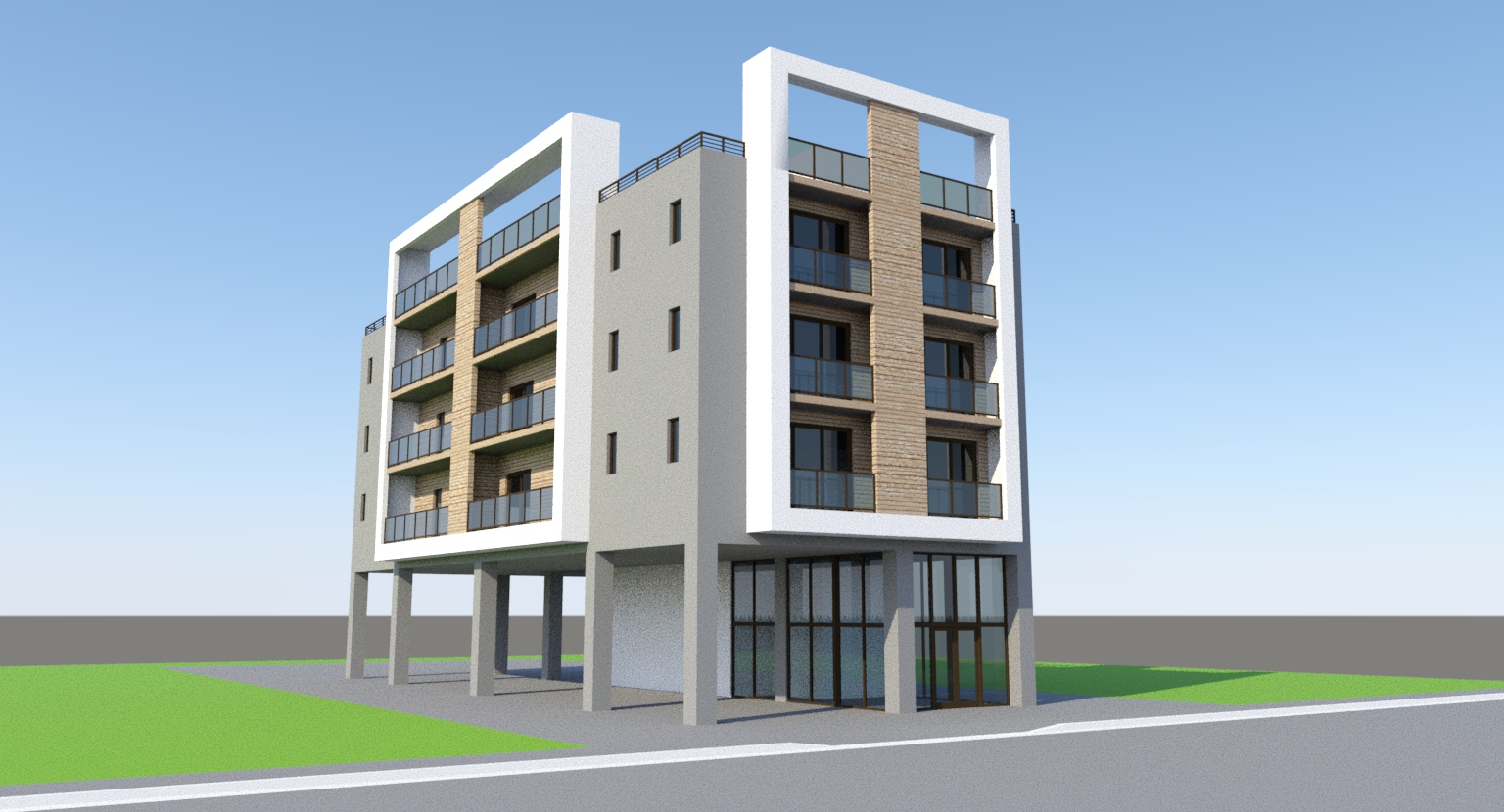 open area around the building grass with small tropical landscape