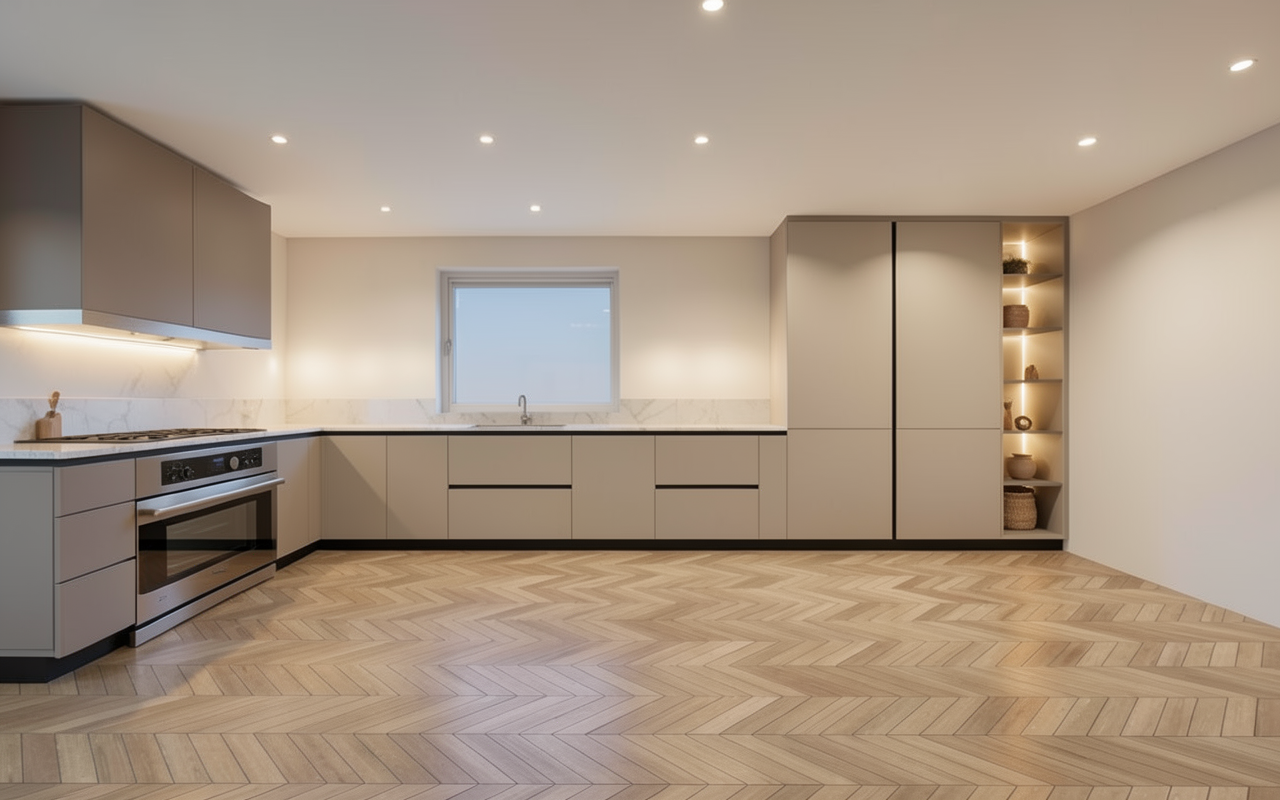solid medium wood cabinets with white arch and light marble backsplash