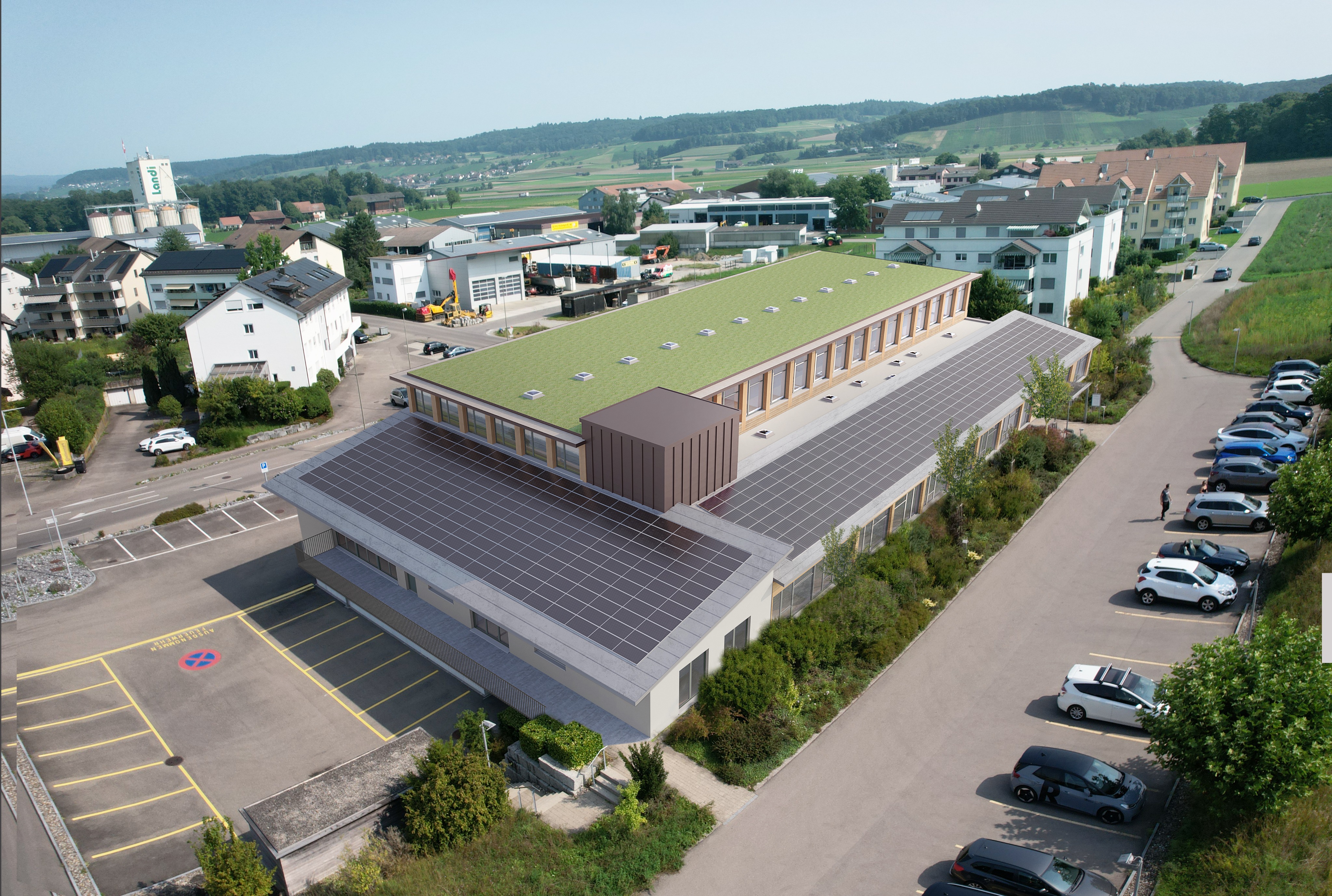 birds eye view keep geometry and materials improve the light of a clear morning day less saturation add in the roof color green an extensive green roof with flowers wild grass and a lot of shrubs dont change the photovoltaic panels on the roof