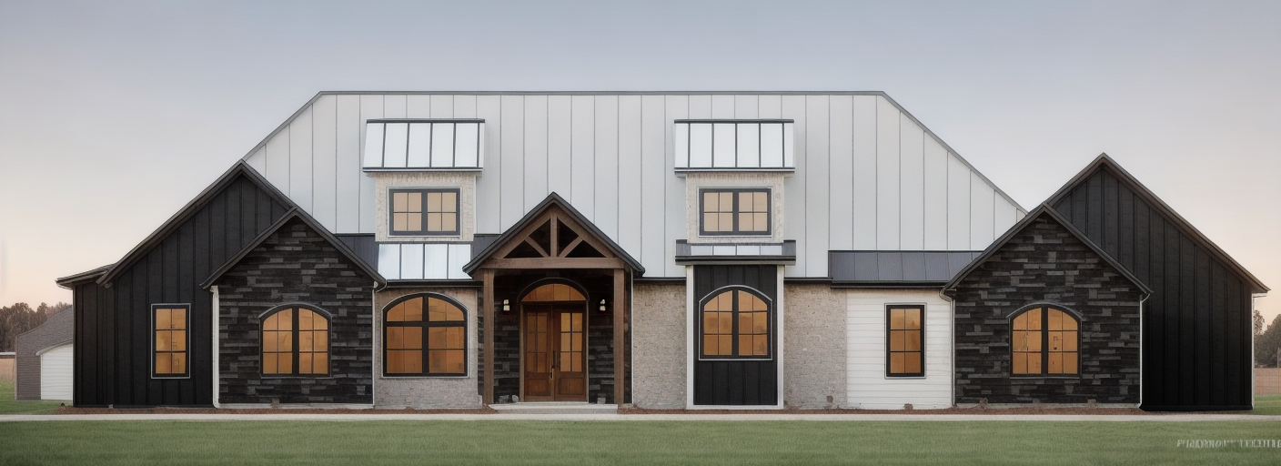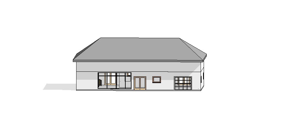 looking directly at the building from the perspective of standing on a dock looking directly at the building behind the building is a parking lot with tropical foliage beyond the parking lot the building is very pale yellow with white trim the trim around the window is also white the roof is light color metal the sun is setting in the distance the roof has an 8 foot overhang across the front only