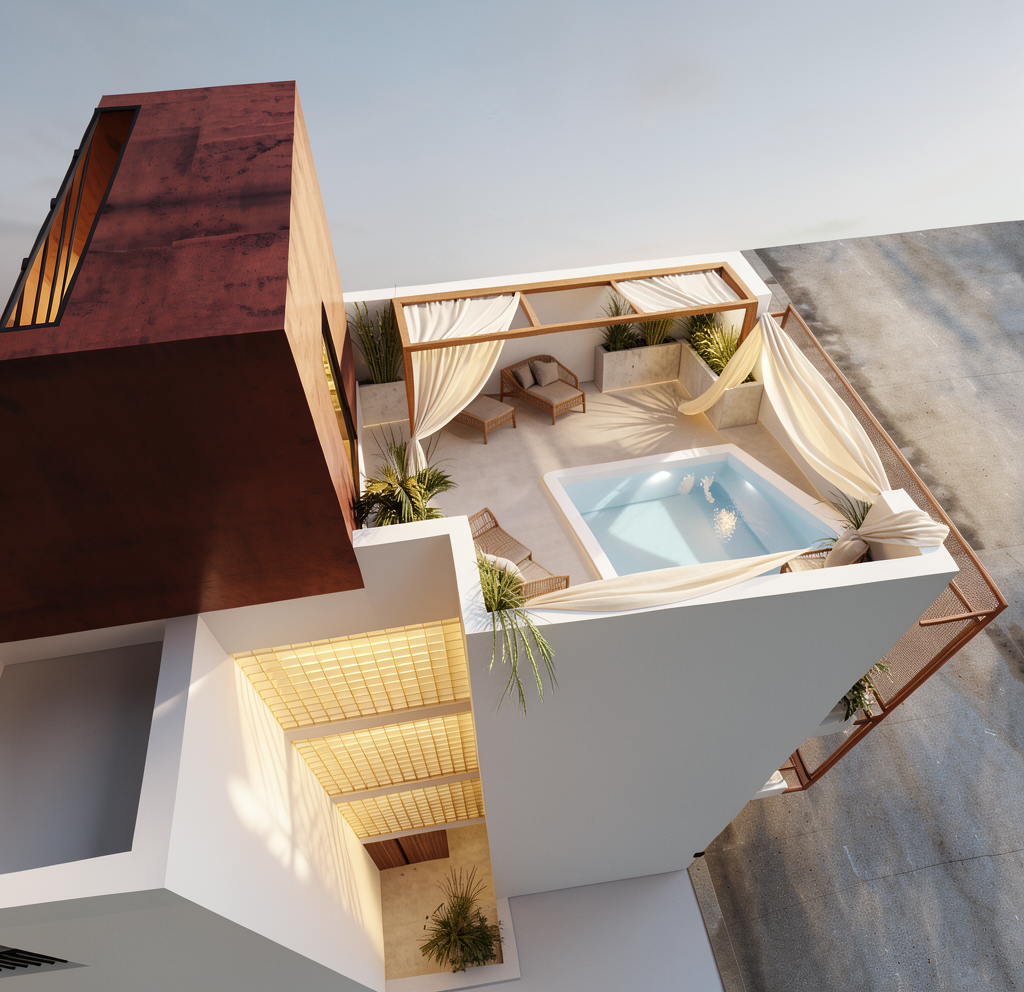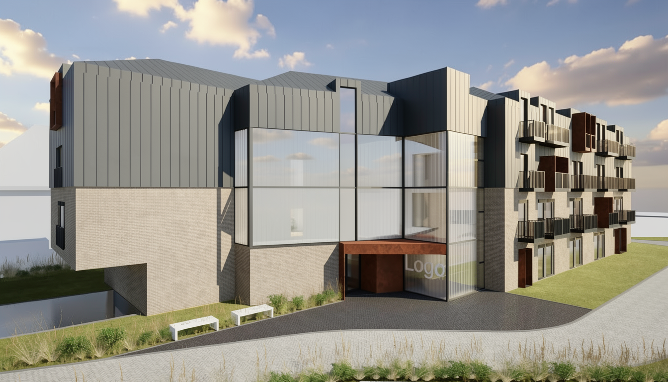 autumn sunny afternoon building light gray facade lots of pants and trees