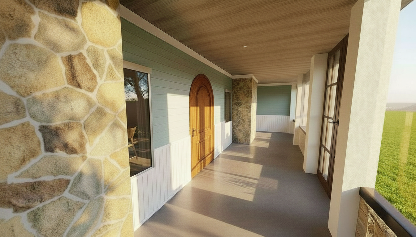 create a beautifully rendered image of a cozy porch featuring a harmonious blend of materials and colors the walls are adorned with stone showcasing warm shades of sand and beige the wooden door is a rich double french arched door with glass panels inviting dark brown set against walls of soft blue above the ceiling is a light natural wood the flooring is a subtle dove gray complementing the overall palette sunlight streams in casting soft shadows and creating a tranquil inviting atmosphere the wall on the right side is lined with mesh screens that are partically see through the bottom 1 3 of the screen wall has a sill with white bead board below the far wall had a small arched doorway opening leading to a room lined with more windows