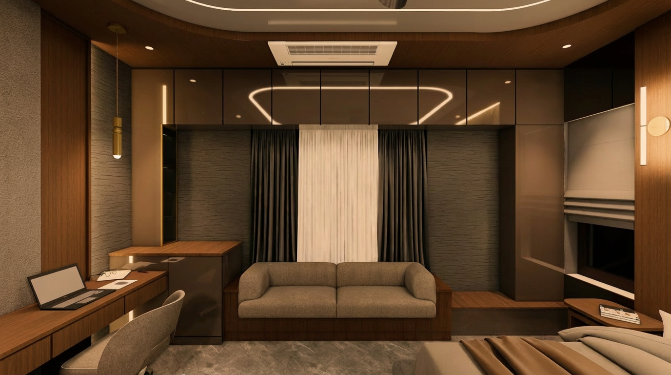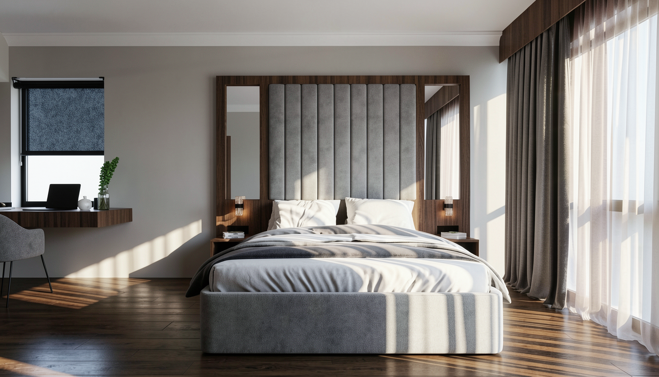 edit this bedroom render while keeping the design exactly the same do not change the layout bed design headboard design mirrors desk chair curtains window treatment wall design lighting placement proportions composition or camera angle preserve everything exactly as shown change the wood finish on the headboard frame side panels desk curtain pelmet and all visible wooden elements to a light oak veneer the oak should look refined natural and premium with soft warm light oak tone elegant straight veneer grain subtle natural tonal variation seamless texture mapping matte to matte satin finish realistic veneer depth without heavy knots or rustic character also fix the floor so it matches the same light oak veneer tone and character the floor should feel consistent with the wood elements in the room with realistic light oak texture natural plank definition clean premium finish subtle variation between boards believable grain scale soft realistic reflections make sure the wood on all elements feels like it belongs to the same material family same light oak mood same undertone same realism level visually coordinated but still natural not flat or repetitive keep the upholstered bed bedding curtains and all non wood materials unchanged in design improve realism only where needed so the new oak finish looks fully integrated and photorealistic important do not redesign anything do not change shapes do not add or remove objects and do not alter the styling only change the wood finish to light oak veneer and make the floor match it properly negative prompt dark wood walnut wenge reddish wood yellow wood rustic oak heavy knots different floor material mismatched wood tones changed design changed layout changed bed changed curtains extra decor missing objects distorted texture blurry grain unrealistic wood mapping add this line too for stronger control the headboard wood desk wood pelmet wood and flooring must all match as one coordinated light oak veneer material palette