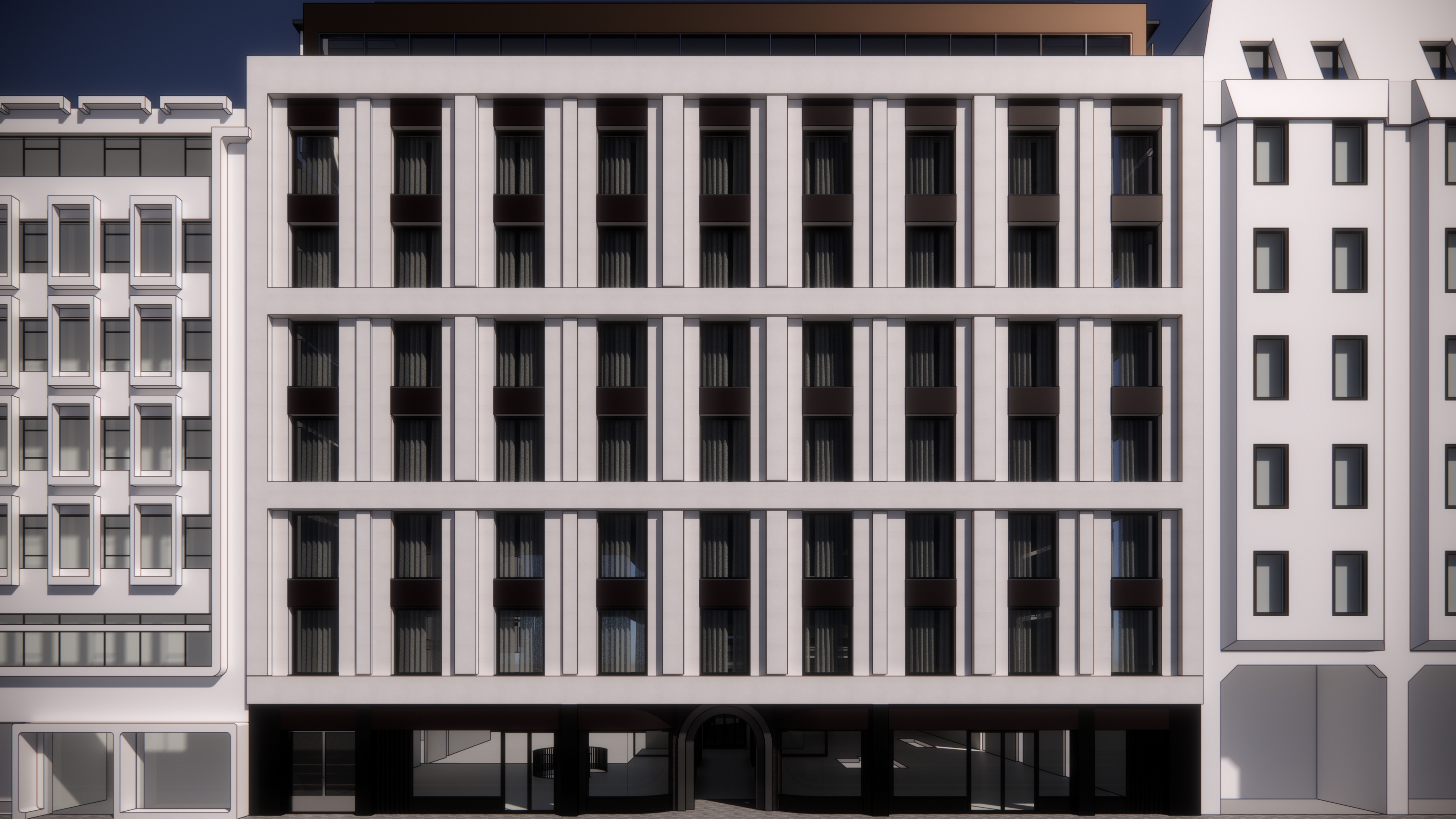 this is a portland stone facade please improve materials and reflections on the ground floo add some people and restaurant on the back keep the ground floor material as a metal black