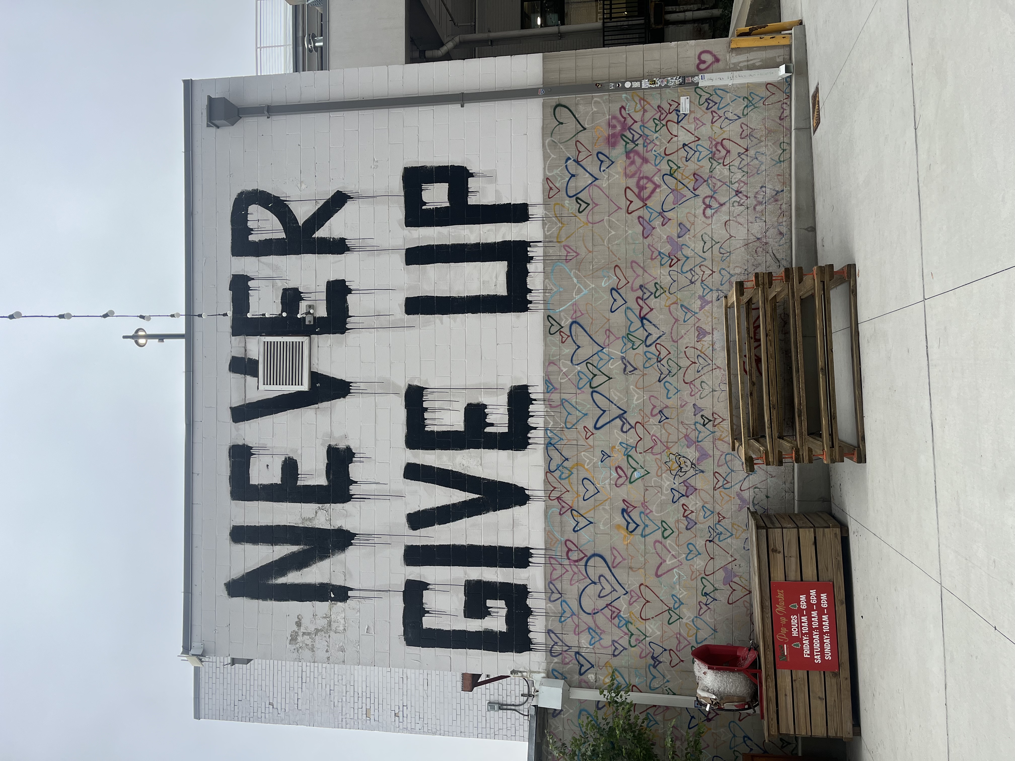 using this building keeping the graphic never give up as is historically protected add three windows the lettering will be re stenciled on the windows the two side windows left and right will be symmetrical the window in the center should be the same height but wider they will start at the top level of the heart graphics the heart graphic is also protected we need three windows at that level the same width of the top windows and only 30 tall they will be 12 inches under the top of the heart graphics remove pallets and other extraneous elements let s do some landscaping in geometrical planters in front place three 2 top tables with a couple at each one also the windows need to allow to see the interior lights this will be a high end bar