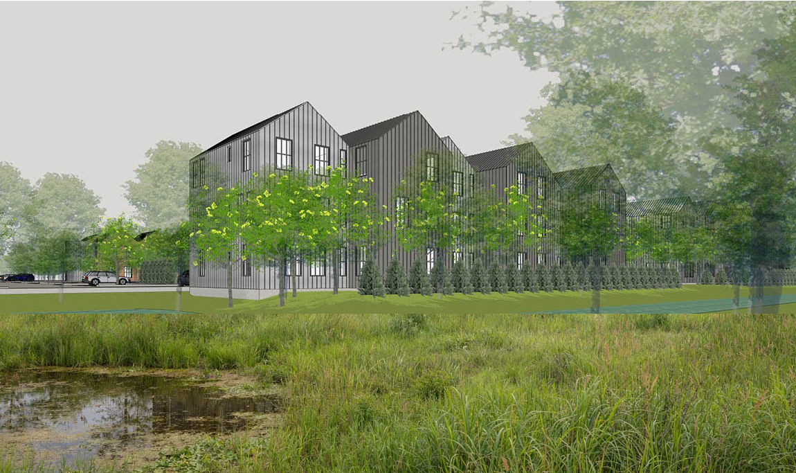 buildings in front are dark and light metal rainwater collector small pound in front with little water and plants in it tall wild grass around buildings small trees in front of buildings