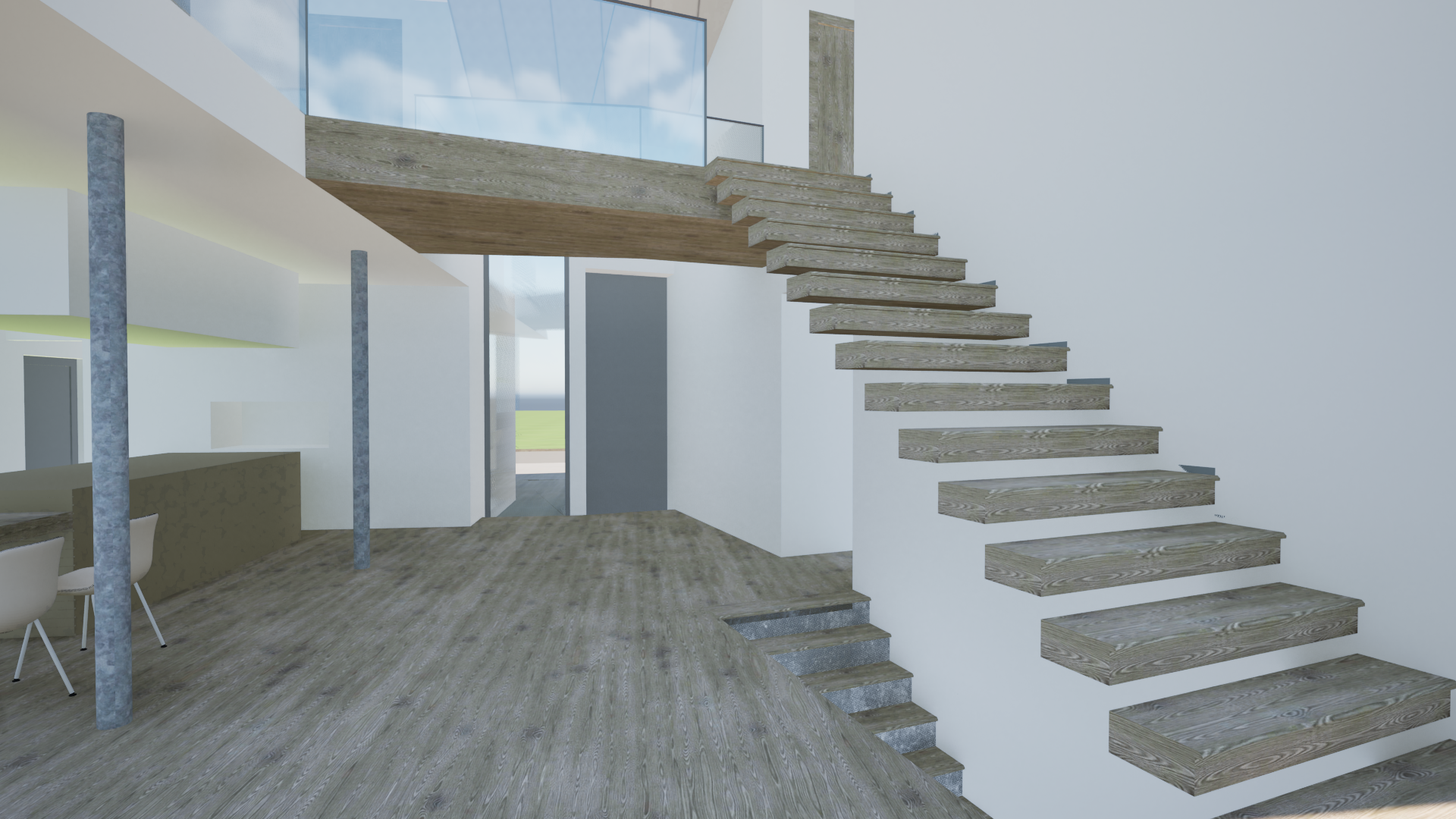 enhance the existing architectural rendering while strictly maintaining the original camera position perspective framing and composition do not alter the geometry proportions or design of the building create a calm high end photorealistic visualization that conveys a refined and professional atmosphere the image should feel natural balanced and realistic as if captured with professional architectural photography use soft natural daylight with realistic global illumination subtle shadows and accurate material reflections improve material quality with highly detailed physically accurate textures concrete glass metal wood etc ensuring correct roughness reflections and depth glass should have realistic transparency and subtle reflections surfaces should show slight natural imperfections to avoid a cgi look refine lighting and color grading to achieve a harmonious warm and inviting mood without becoming dramatic or over stylized avoid exaggerated contrast or artificial effects the atmosphere should feel calm and sophisticated enhance environmental details landscape sky vegetation people if present to support realism while keeping the focus on the architecture add subtle depth of field only if appropriate maintaining sharpness on the building the final result should look like a premium real estate marketing visualization elegant realistic and professionally presented
