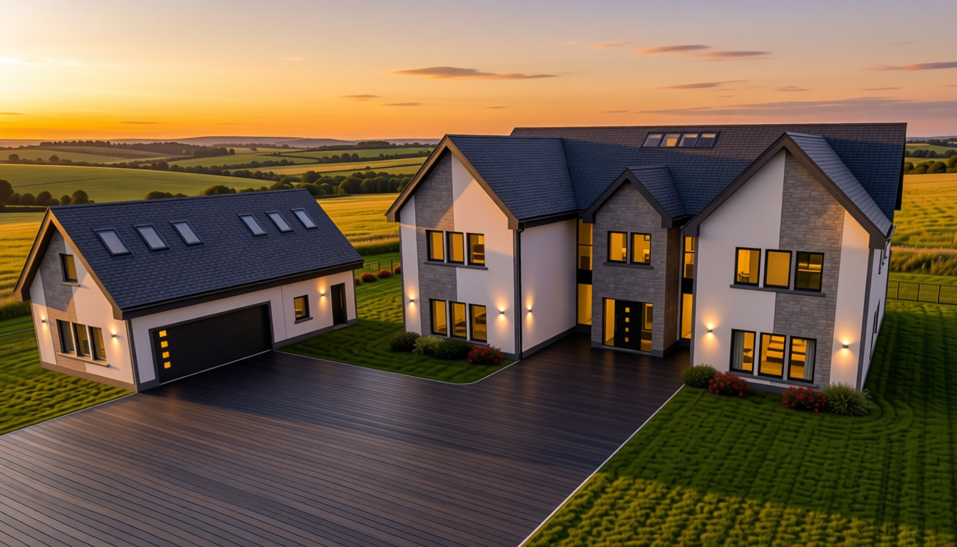 preserve the existing building geometry exactly as shown do not change or add any architectural elements to the house or garage drone height view matching the original angle warm summer evening just before sunset with golden hour lighting and soft natural shadows photorealistic materials and lighting physically accurate realistic textures subtle warm interior lights visible through the windows creating a gentle warm glow natural landscape enhancement only realistic grass driveway and rolling countryside in the distance looks like a real photograph no stylization stone chip driveway manicured lawn 4k resolution