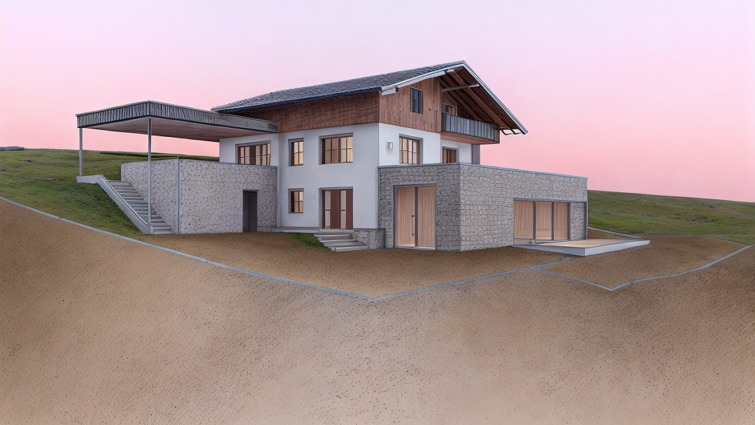 replace the wooden cladding with photorealistic vertical slatted wood in a natural color with visible grain and subtle tone variations keep the stone wall texture exactly as it is but render it as natural aosta valley white stone with irregular joints and authentic local texture replace the current background with a neutral minimal one soft grey or white to highlight the building ensure high resolution photorealistic architectural quality