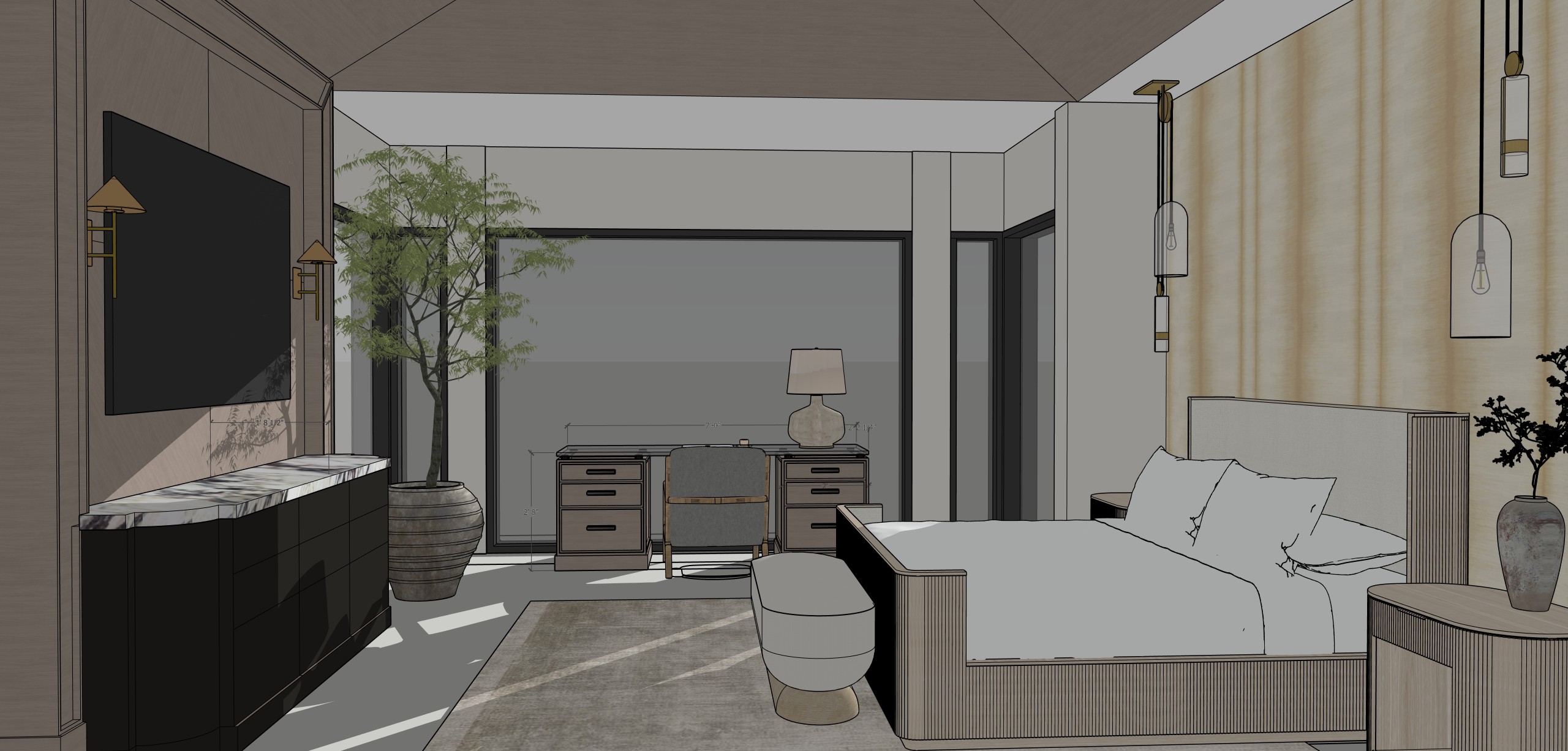 make this a photorealistic image the flooring is a midtown wood wide plank similar wood stain to the desk but has variation in wood tone turn the table lamp on the view is of the water in tampa bay turn the pendant lights on over the nightstands