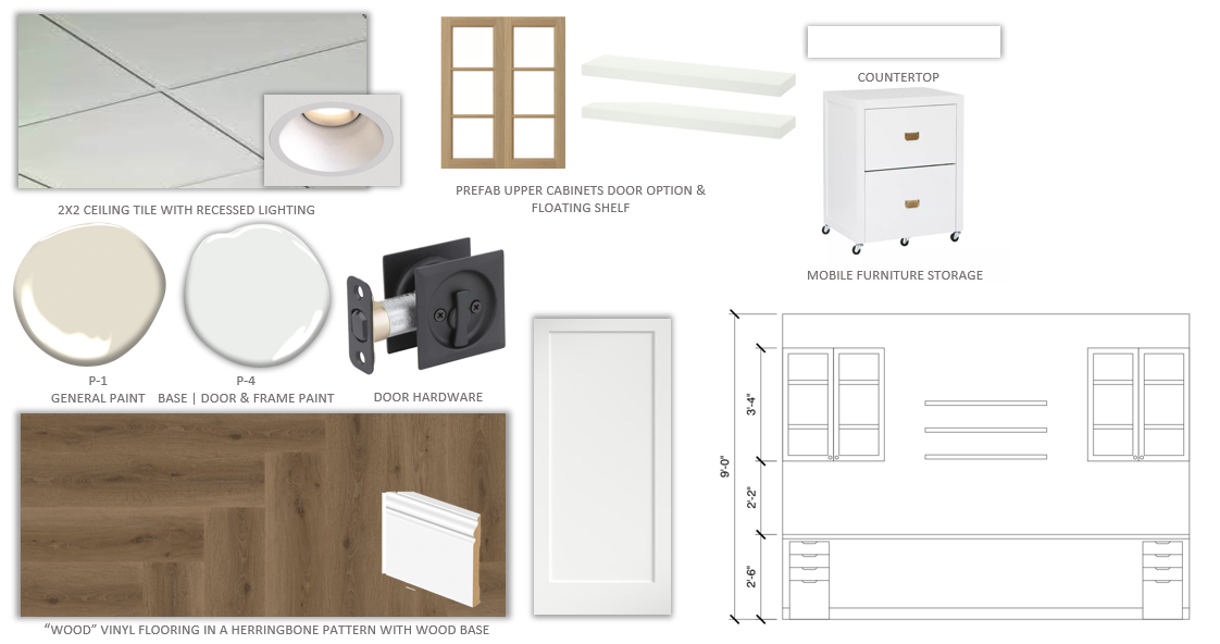 create a minimalist and modern interior design visualize a room with 2x2 ceiling tiles highlighted by warm recessed lighting the flooring is vinyl with a rich wood texture in a herringbone pattern complemented by a sleek white baseboard walls are painted in a soft off white p 1 with doors and frames in a crisp white p 4 include upper cabinets with natural wood doors and floating white shelves a mobile furniture storage piece stands with a fresh white finish and elegant brass handles the overall atmosphere is serene and inviting with a harmonious blend of light wood tones and warm whites no windows are in the office