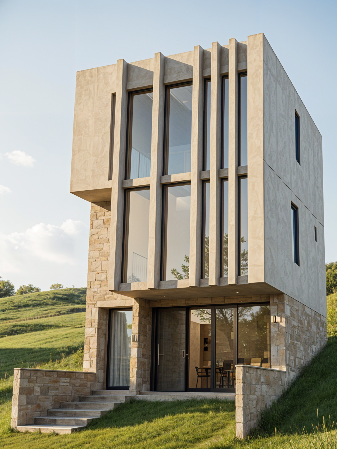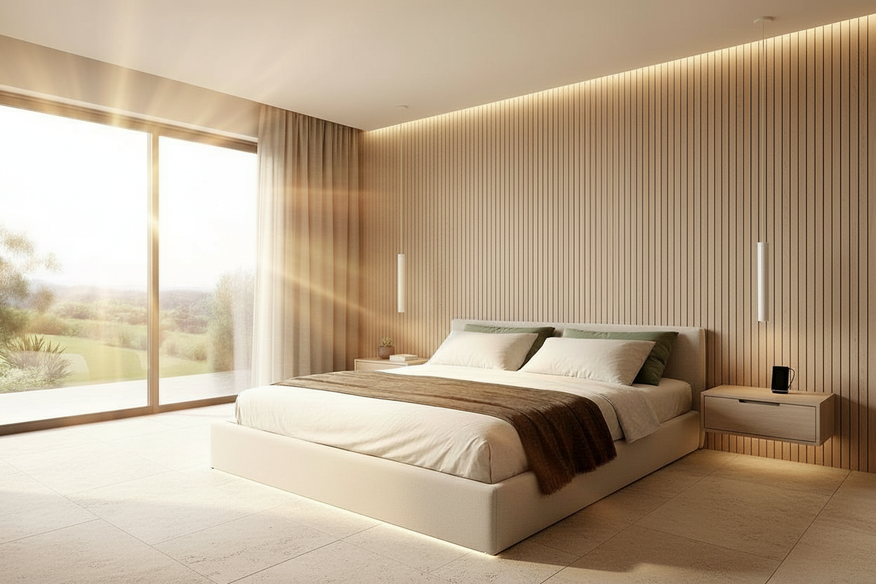a high resolution photorealistic interior photograph of a modern bedroom the scene includes the bed with its specific bedding the slatted wood wall with cove lighting the pendant lights and both nightstands the existing floor is replaced with a luxurious new floor of warm rich walnut wood planks the lighting is now soft diffused and filtered natural light removing all harsh sun shafts and lens flares positioned symmetrically on the new walnut floor on either side of the platform bed are two premium ultra plush organic shaped flokati wool rugs like natural clouds of wool one near the left nightstand and one near the right the garden view is seen through the large glass wall under this softened light the overall atmosphere is composed and serene