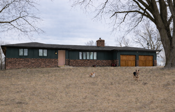 add landscaping and make the front door the same color but add some glass to it transform this architectural interior design drawing into a photorealistic rendering maintain the exact layout dimensions and placement of all elements do not change materials colors or geometry additionally apply a very subtle hand drawn architectural sketch overlay faint pencil line edges around furniture silhouettes cabinetry and key architectural elements as if barely sketched over the photograph keep it extremely subtle the photorealistic image must remain fully dominant