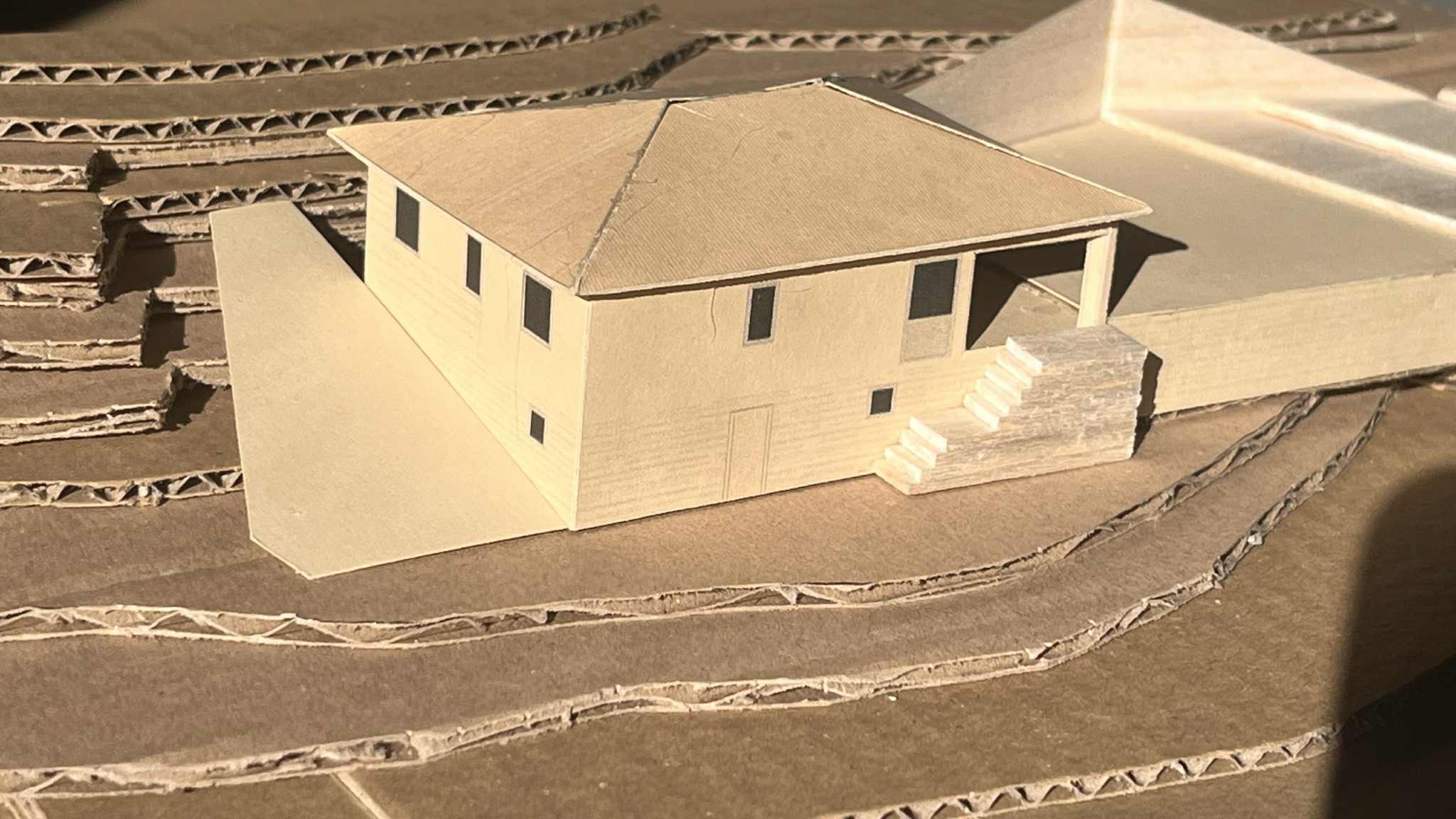 vivienda unifamiliar en asturias con planta baja revestida de piedra y planta primera con mortero de cal y ventanas negro mate la estructura de cubierta es de madera y cubierta con teja cer mica curva est rodeada de c sped y rboles entre la planta baja y la primera hay una escalera exterior revestida tambi n de piedra y un muro de piedra que sostiene un patio situado delante del porche de la casa que se usa para aparcamiento de coches la hora del d a es el amanecer
