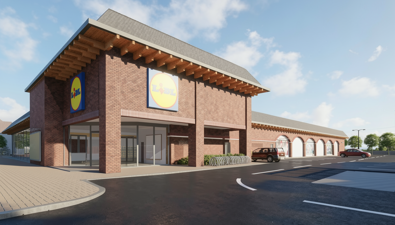 important preserve the existing geometry and the existing context exactly as provided do not modify alter reinterpret add remove scale or reshape any geometry do not change the site surroundings street layout neighboring buildings vegetation or context elements do not modify geometry scale proportions buildings road layout sidewalks or surrounding context in any way do not modify text delete all people and cars lidl shop interior inside the building warm light interior