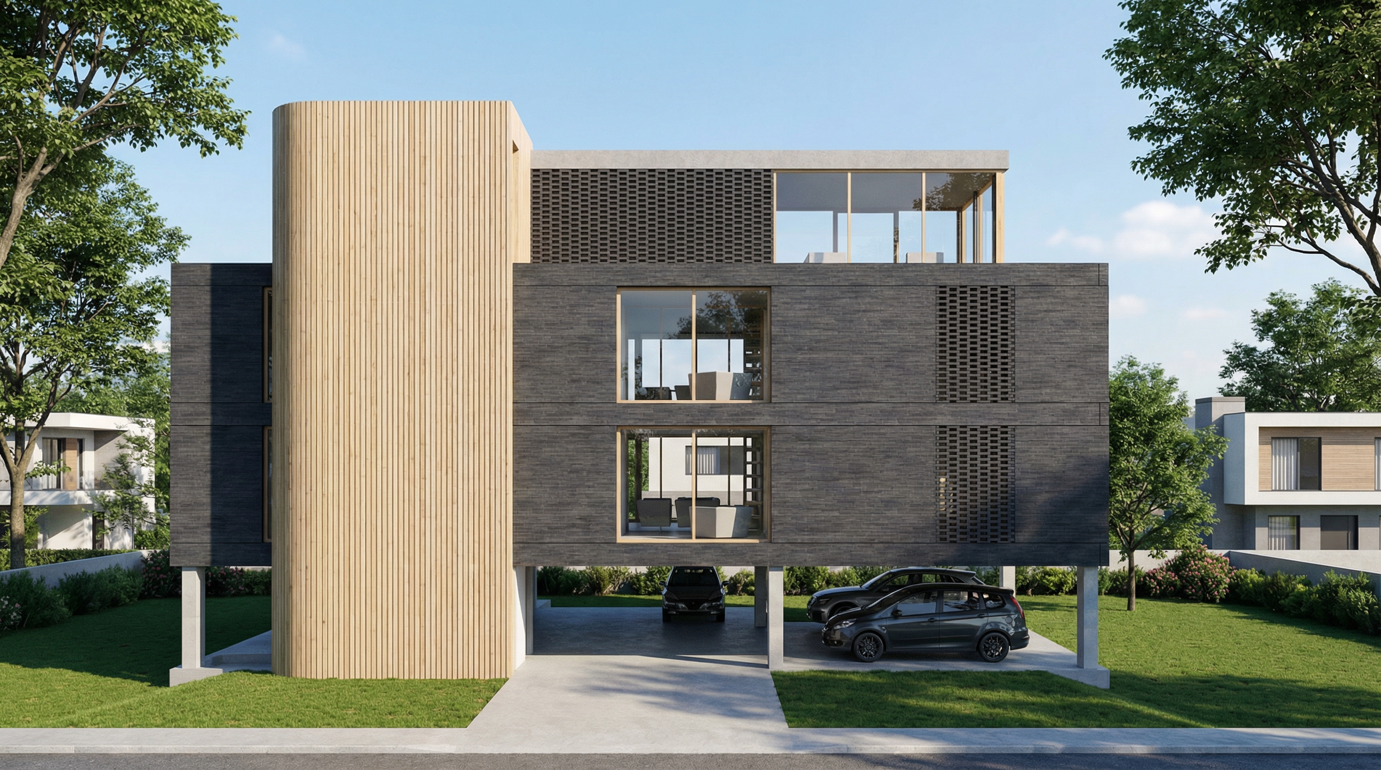 house should be white with a light brownish gray metal roof white garage doors white windows all white trim a dark brown wood front door with tropical landscaping