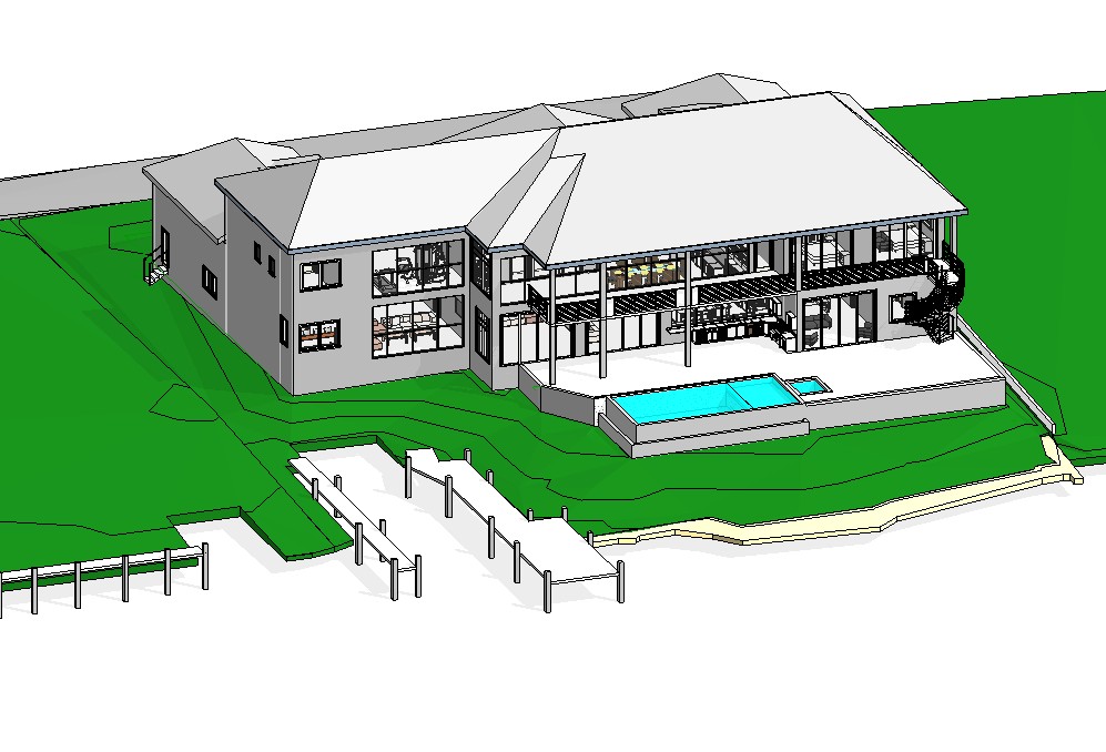 the home is situated on turquois bay waters that occupy all of the foreground that is shown in white with no beach the background behind the house is tropical hardwood and palm trees there is a dock shown on the left side the pool shown is infinity edge with spa next to it the walls of the home are light colored there is a coral stone facade on the lower level the roof is light colored metal there is a spiral staircase coming down from the balcony on the right front side no tree is on right side of deck