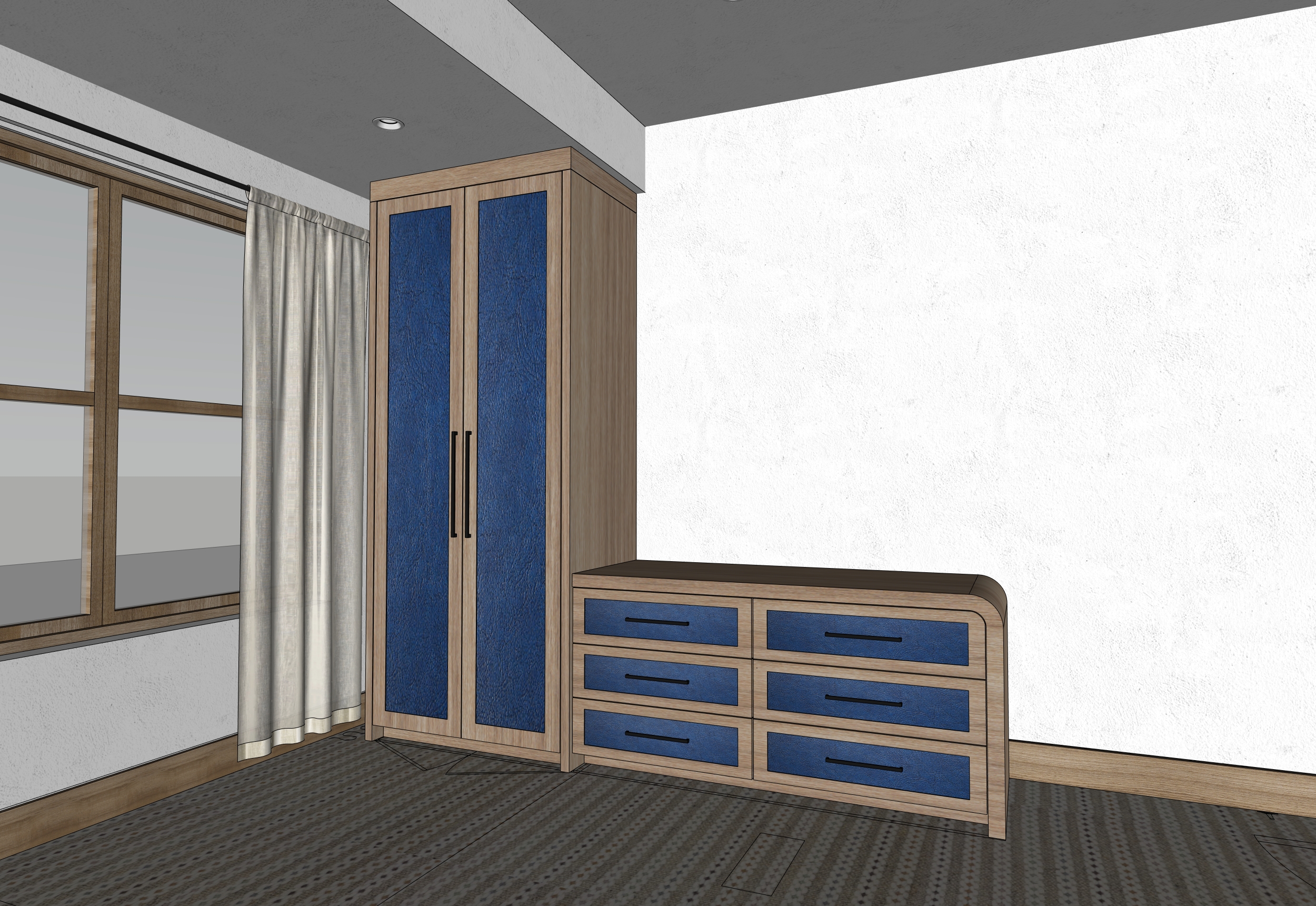 enhance this image with overall soft interior lighting the blue leather panels should be a soft slightly stressed navy leather do not show any image outside of the windows but have a soft natural light coming through soft shadows throughout