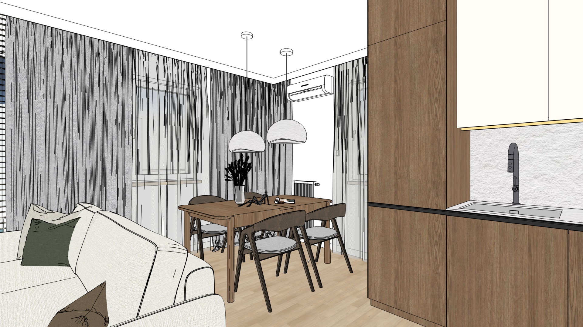 illumination in the interior as on a cloudy day transform the input interior design photo into a hyper realistic architectural visualization of a contemporary modern interior preserve exact geometry layout proportions and material intent from the original design lighting create soft overcast daylight atmosphere similar to a cloudy rainy day without visible rain with diffused natural light entering through windows subtle ambient glow to enhance depth and spatial layering maintain balanced contrast no harsh shadows no overexposure materials textures enhance material realism micro details surface imperfections soft reflections accurate roughness physically correct light response emphasize textures wood grain fabric weave stone concrete metal and matte finishes high micro contrast and tactile depth rendering style ultra photorealistic architectural visualization cinematic quality natural color grading neutral tones soft highlights realistic global illumination physically based rendering high dynamic range premium interior photography style camera composition wide angle architectural lens natural perspective eye level viewpoint deep focus sharp details across the frame natural framing no distortion atmosphere calm elegant contemporary premium residential mood clean minimal refined without visual noise output 8k resolution ultra detailed noise free crisp edges professional architectural rendering quality negative prompts no rain droplets no lens flares no fog no haze no bloom no motion blur no cartoon no stylization no oversharpening no artificial glow no unrealistic reflections no distortion no clutter pod klimatyzacj jest bia y grzejnik sofa jest bez obram wki materia u po lewej stronie jest bia e w skie okno z parapetem za firank nad sto em s chropowate lampy o delikatnej strukturze bia ego baranka