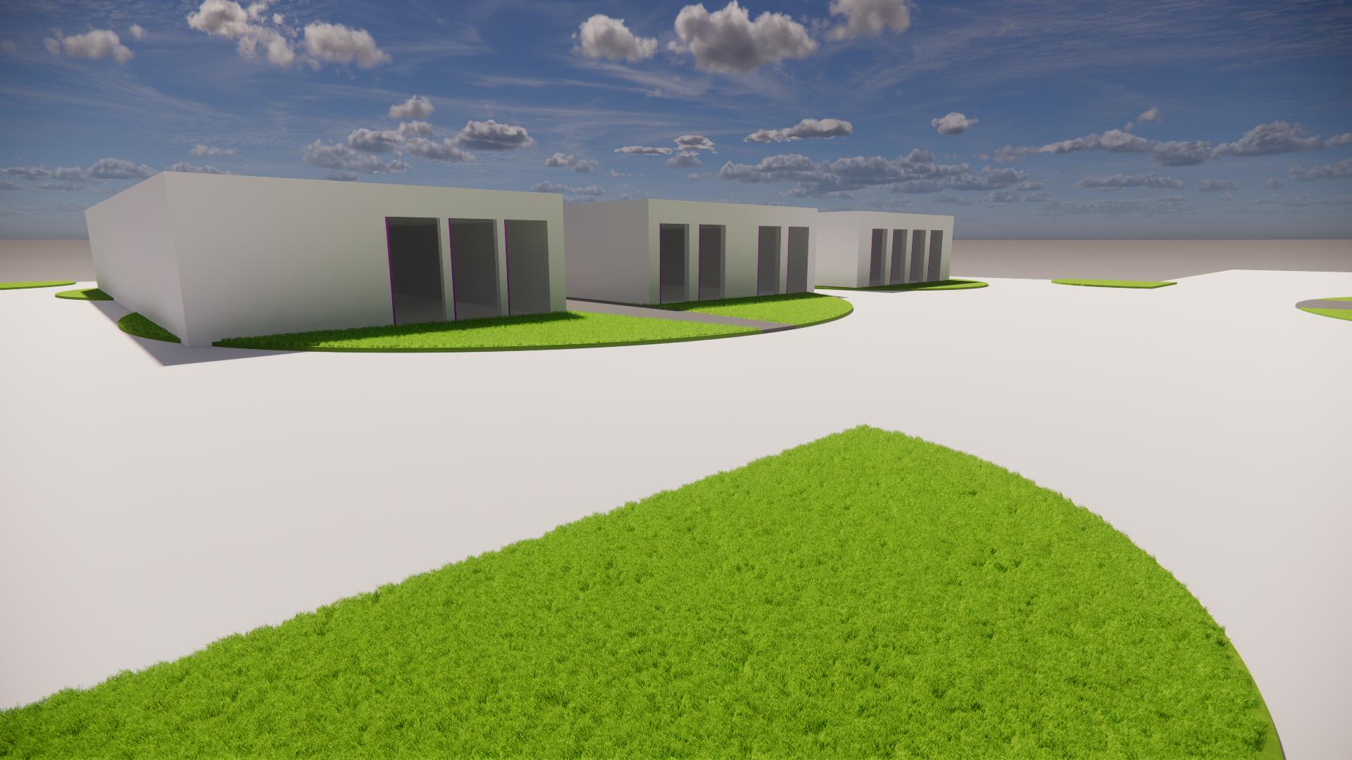 the buildings should be made of reinforced concrete the green surfaces should include low planting and there should be people walking around the area through the windows people and looms should be visible inside