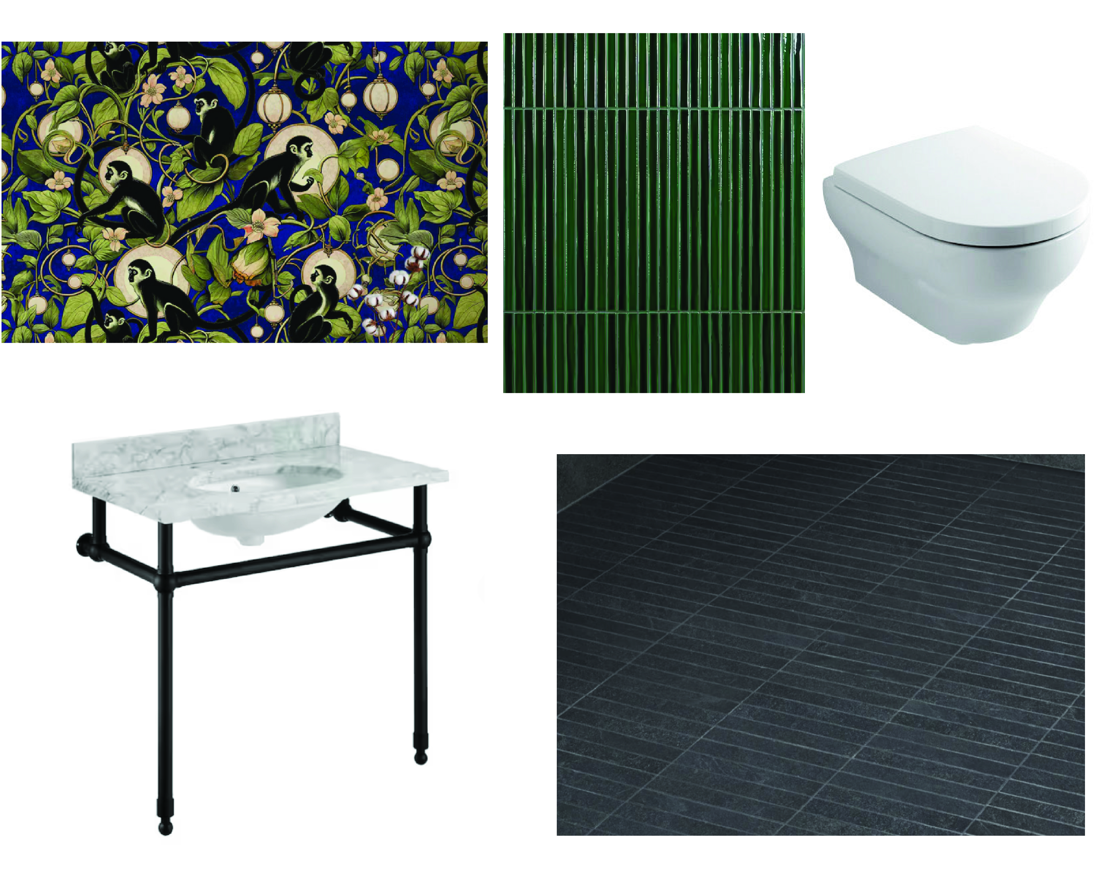 medium sized half bath green tile on wall bottom half black small rectangular tile on floor black faucet and fixtures rectangular frameless backlit mirror