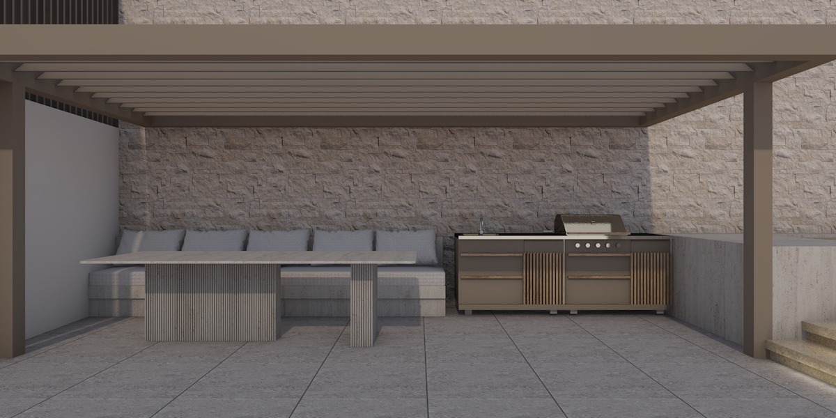 as a continuation of the exterior fa ade this area features an outdoor living and dining space with a travertine dining table as the central element a pergola in a sand tone is positioned above providing shade while maintaining the light neutral aesthetic of the composition behind the main view a built in sofa is integrated into the structure finished with off white waterproof cushions and complemented by decorative dusty olive green linen accent pillows arranged in a clean and elegant manner on the right side there is a built in bbq in a beige finish detailed with linear wooden handles as shown in the reference on the right the steps are enhanced with concealed lighting beneath each tread creating a soft floating effect and emphasizing the geometry of the staircase