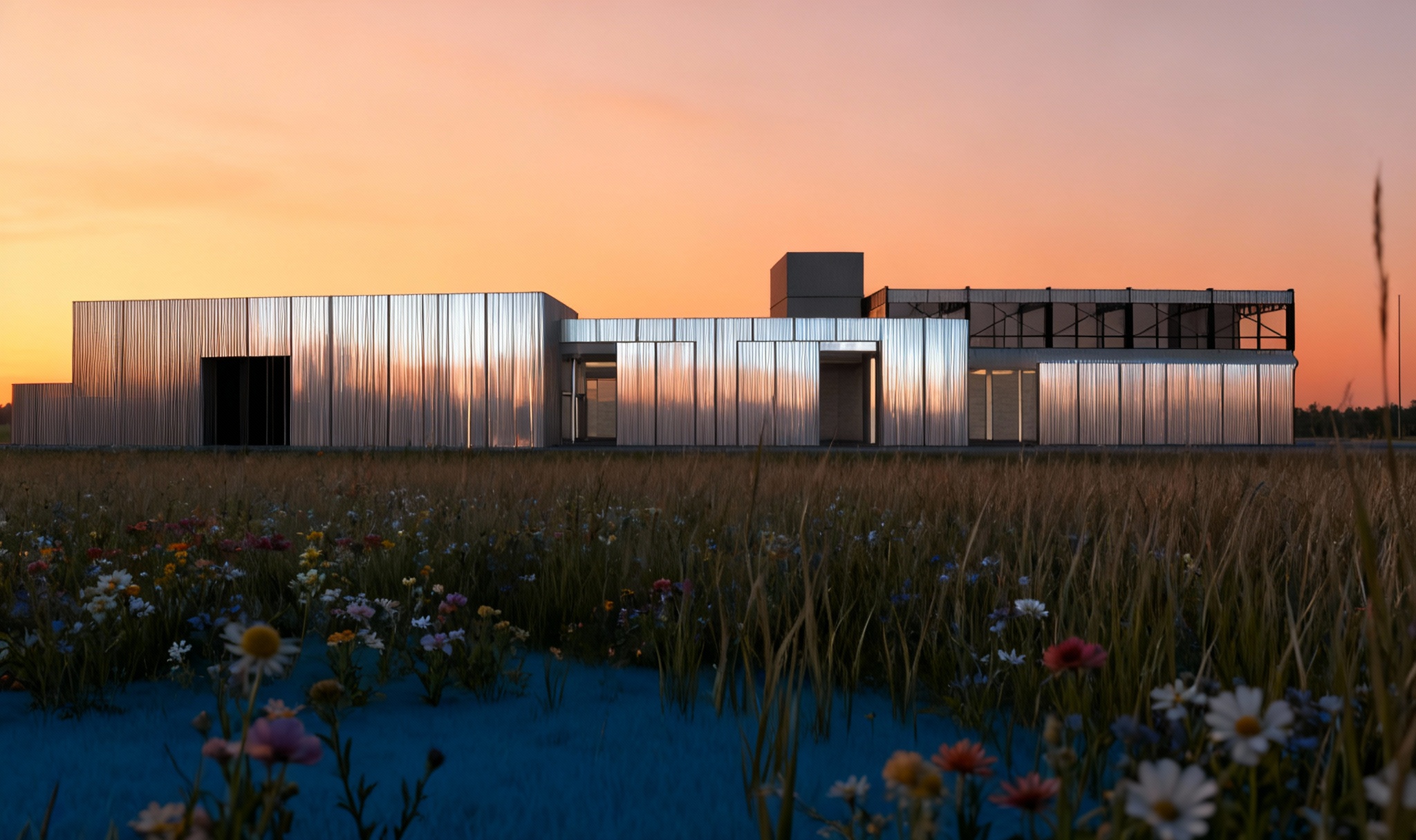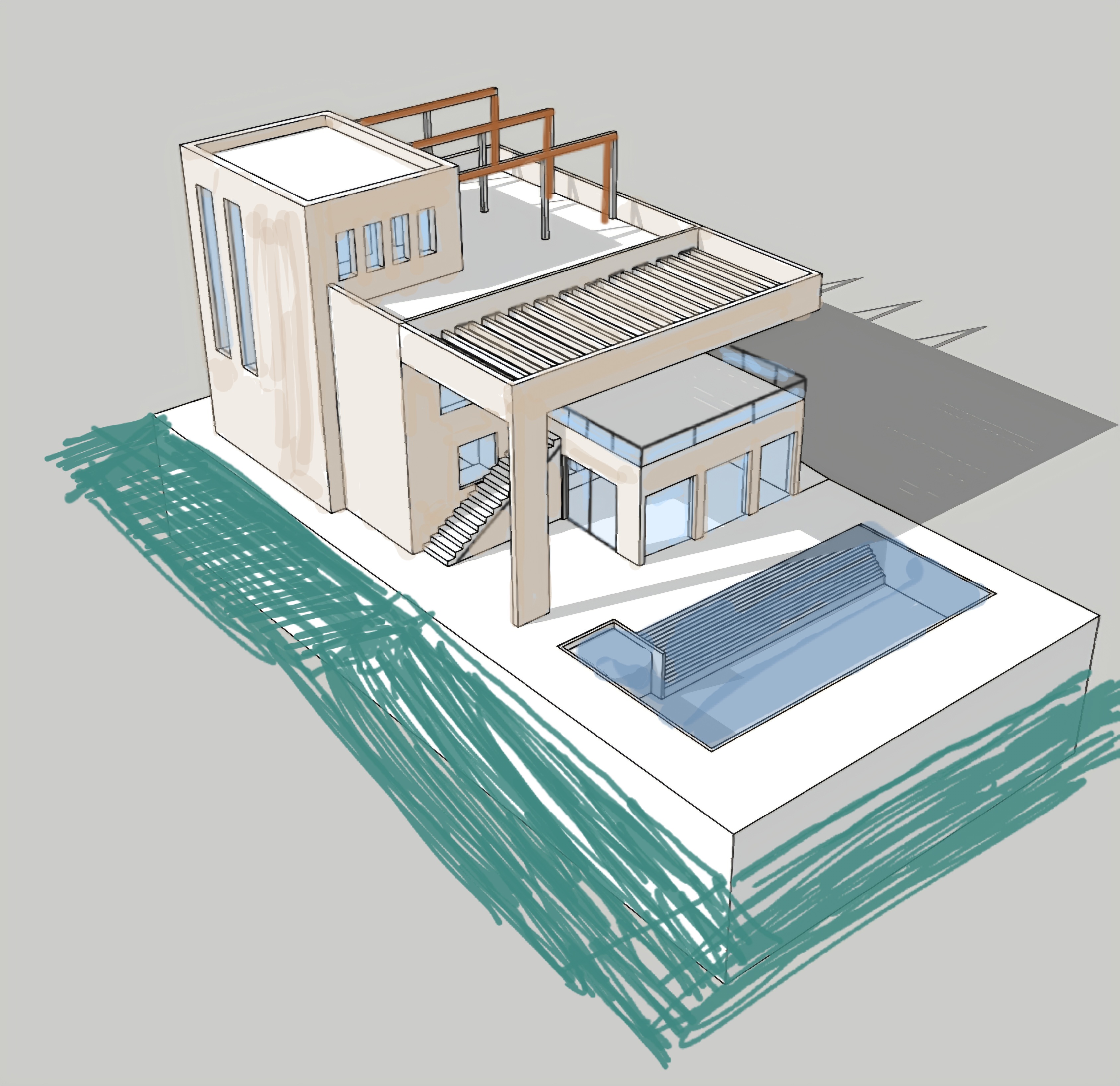 exterior shot white beige modern house straight clear lines with white concrete pergola beams shiny reflective glass windows swimming pool with blue water greenery scene around house