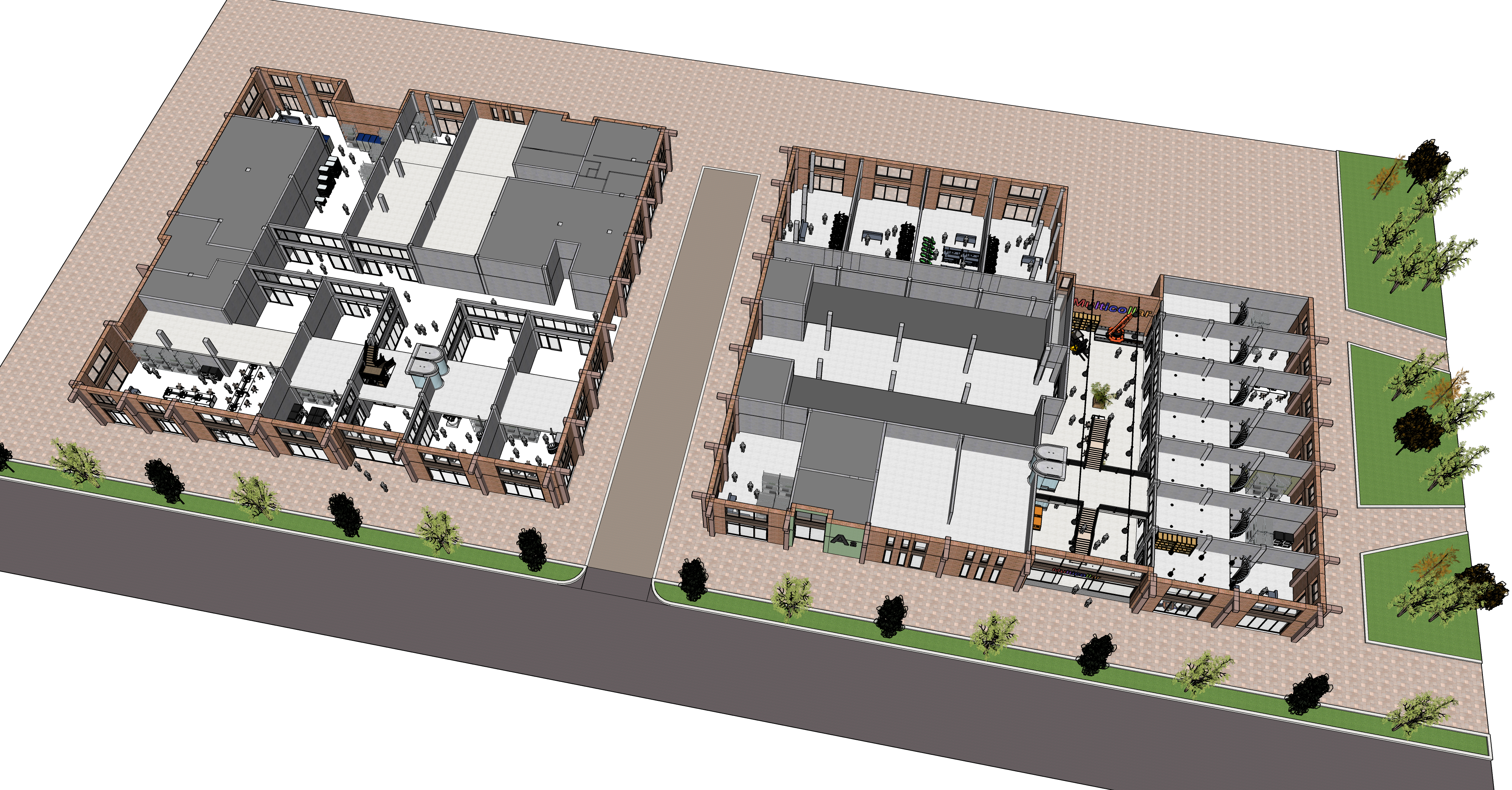 modernist aerial shot top view with internal circulation architecture