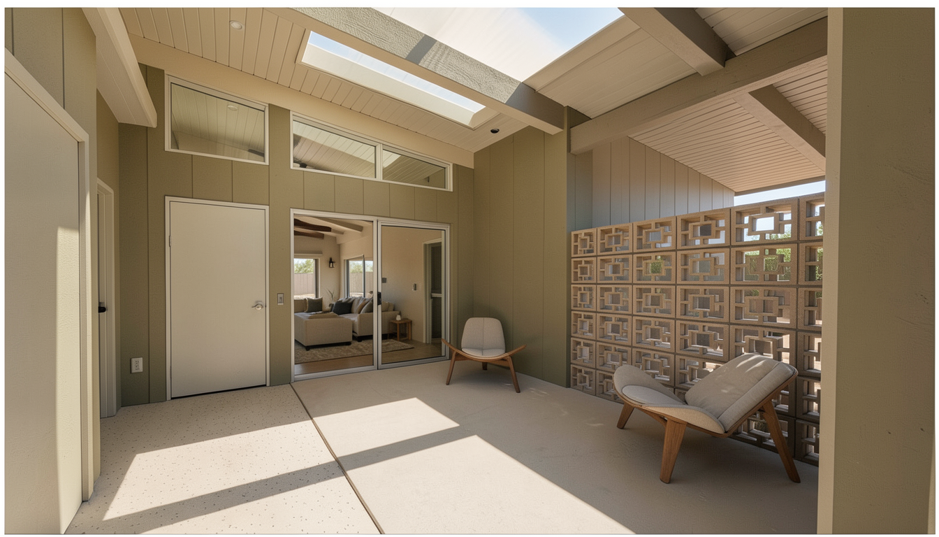 a relaxing japandi inspired modern exterior entry courtyard with a spa like outdoor lounge area in a mid century eichler designed suburban home with natural stained t g ceilings and exposed beams set in arizona with a breezeblock wall separating the courtyard from a carport out of view to the right of frame the main living area of the house is visible behind large windows in the mid range background with the backyard visible behind another wall of windows in the far background