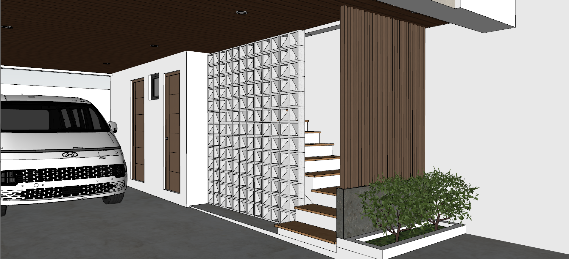 do not change model and finishes texture maintain wood planks at the top of concrete stairs daytime maintain lighting fixture window do not change wooden doors and do not add any sconce maintain the texture of concrete deco blocks maintain the wooden tubular at the stairs