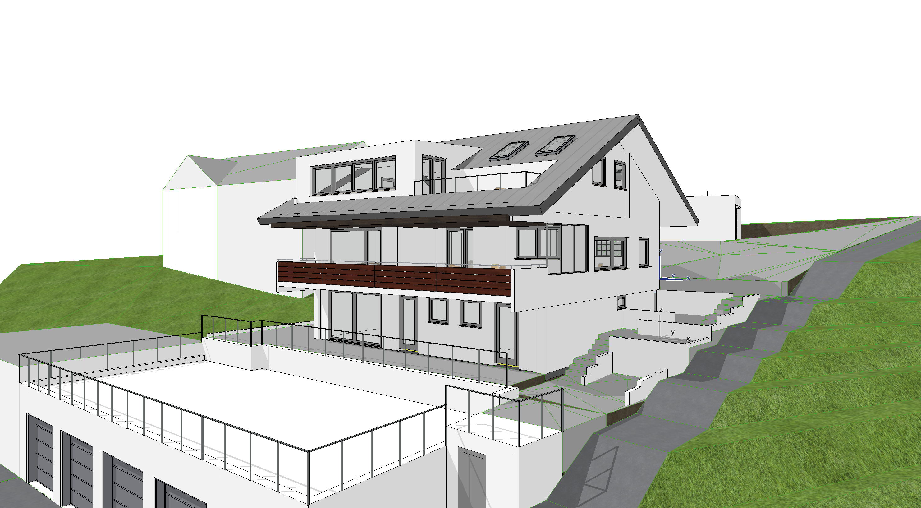 here is a professional english prompt tailored to your project prompt enhance the existing architectural rendering while strictly maintaining the original camera position perspective framing and composition do not alter the proportions or overall structure of the existing building beyond the planned design changes visualize the renovation of the attic including the newly added dormers and the rooftop terrace as well as the newly designed garage ensure that all new architectural elements integrate naturally and harmoniously with the existing structure preserving a coherent and realistic appearance create a highly realistic and forward looking atmosphere that conveys quality sustainability and contemporary living the visualization should feel authentic and believable like a professional architectural photograph extend and continue the surrounding terrain so the environment appears complete and natural the landscape should seamlessly blend into the background avoiding abrupt edges or unfinished areas add realistic ground textures subtle elevation changes if appropriate and natural transitions include 1 3 people in a subtle and natural way to give a sense of scale and livability their presence should feel candid and unobtrusive add carefully placed plants and a few trees to enhance realism ensuring they are proportionate and regionally appropriate vegetation should look natural with realistic lighting and shadow integration use soft natural daylight with balanced exposure and realistic global illumination materials should feature physically accurate textures and reflections with slight imperfections to avoid a cgi look avoid dramatic or overly stylized effects aim for a calm elegant and professional presentation the final result should resemble a high quality real estate marketing visualization realistic refined future oriented and inviting