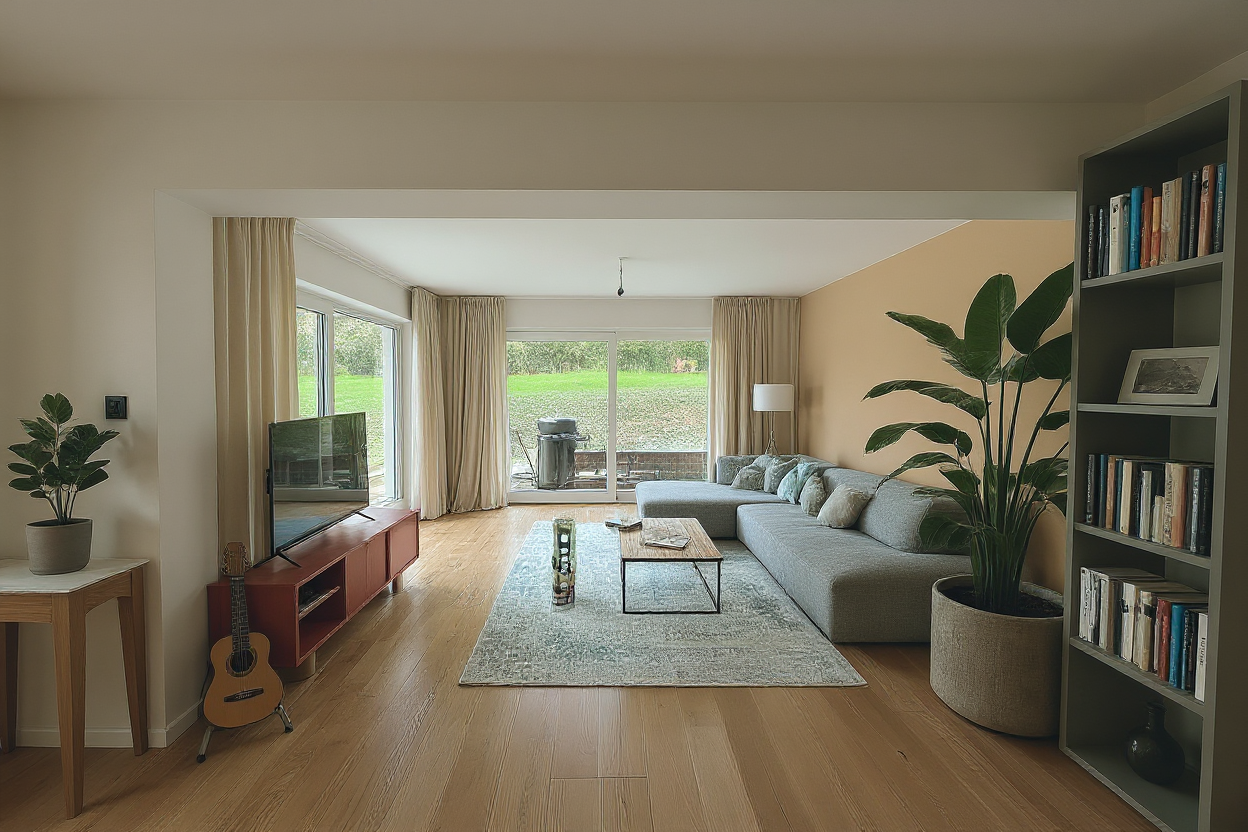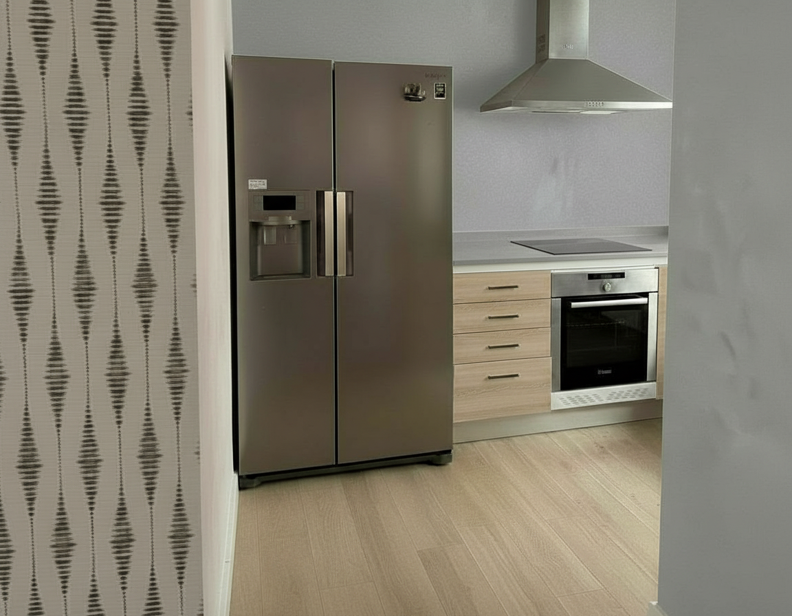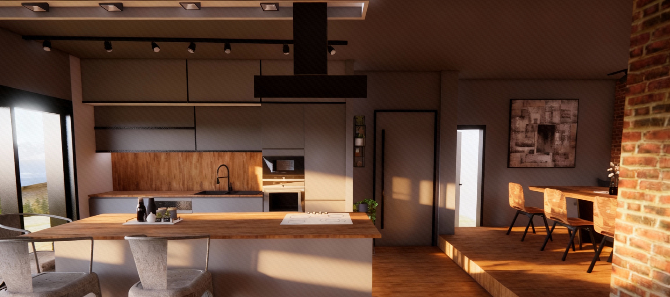 improve this render while keeping the exact same space layout materials and textures preserve the wood surfaces the matte grey kitchen cabinets the black metal details the brick walls the lighting track system and all furniture placement enhance realism sharper material definition realistic reflections improved shadows and better overall contrast do not change the design colors materials or geometry just refine the lighting clarity realism tone mapping and photographic quality style high end interior visualization