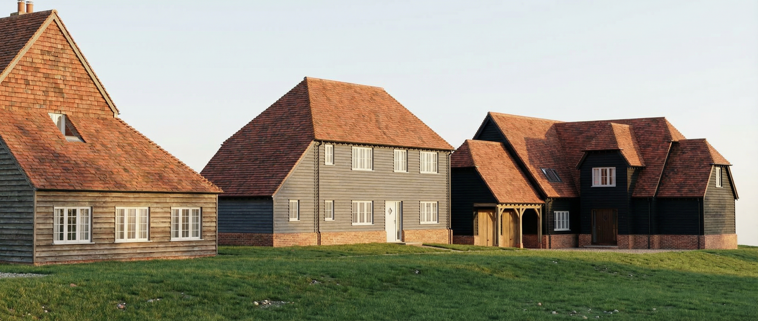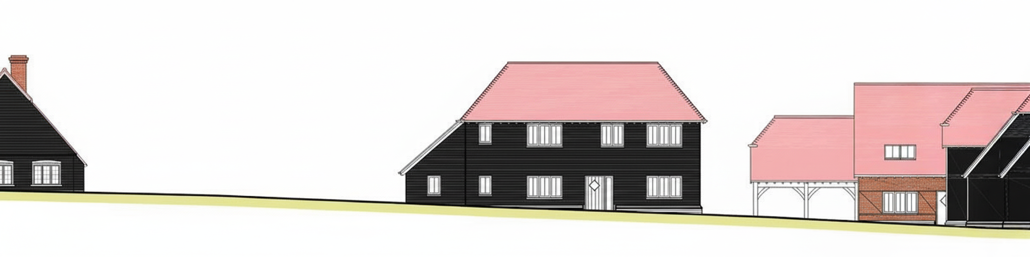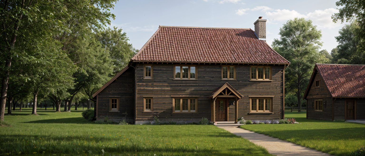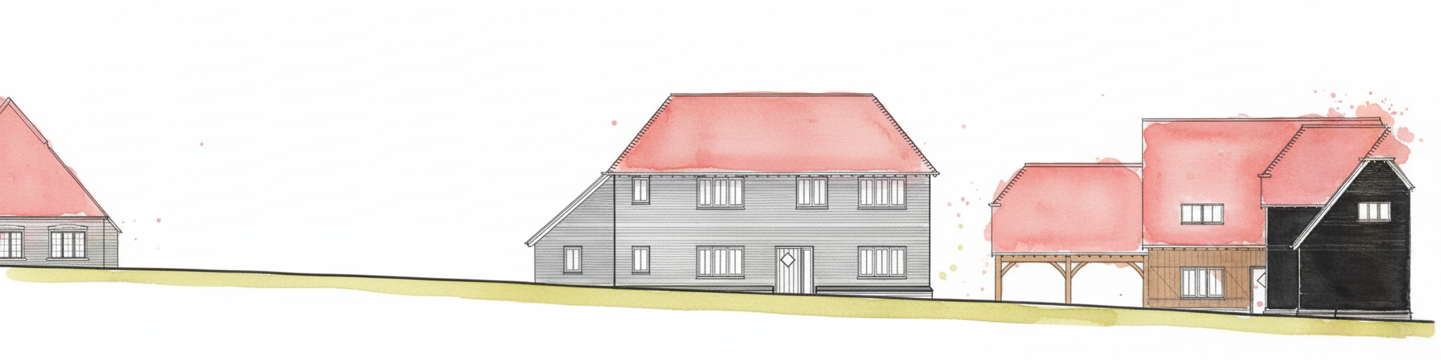 architectural hand sketch rendering of a modern farmhouse finished in antique brickwork in the style of an architects copic marker concept sketch use strong contrast and bold color blocking windows should have black frames and cool blue reflections and linework with visible marker streaks and layering emphasizing depth and tone include foreground trees with dark trunks and soft green foliage loose shadows on the driveway and a soft blue sky wash behind the overall composition should feel energetic balanced and artistic like a presentation board sketch style tags architectural marker sketch hand drawn rendering board illustration architecture