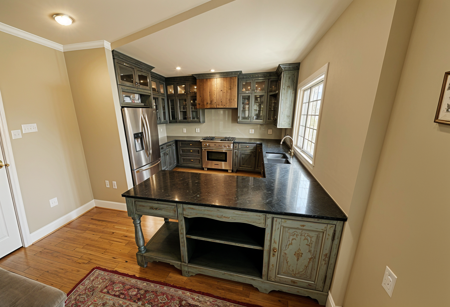 distressed cabinets with dark glazing in early american colonial style inset cabinets with exposed barrel hinges mustard yellow vent hood ship lap walls in raw wood