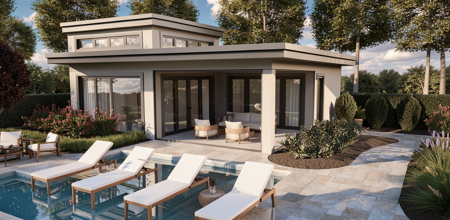 change all siding to a warm white finish maintain cedar style profile maintain stone columns at entry charcoal grey trim on all windows keep window frames and sill in warm white to match siding all doors in dark charcoal grey with modern profiles enhance double height window as feature no changes to architecture enhance details for presentation