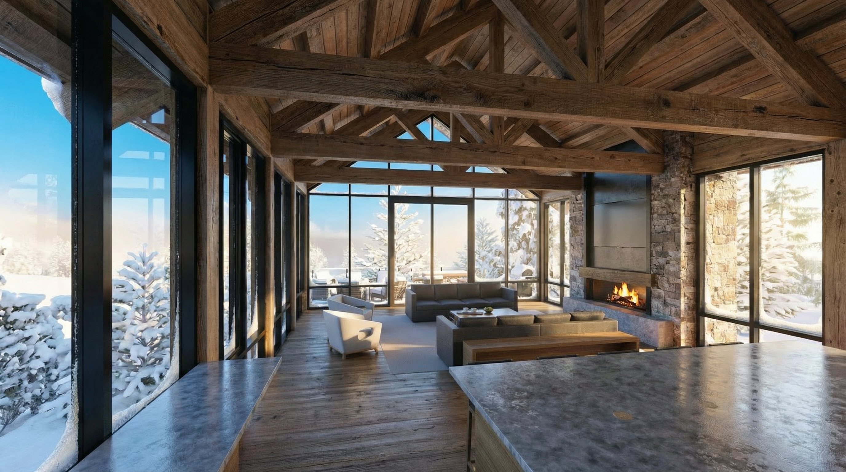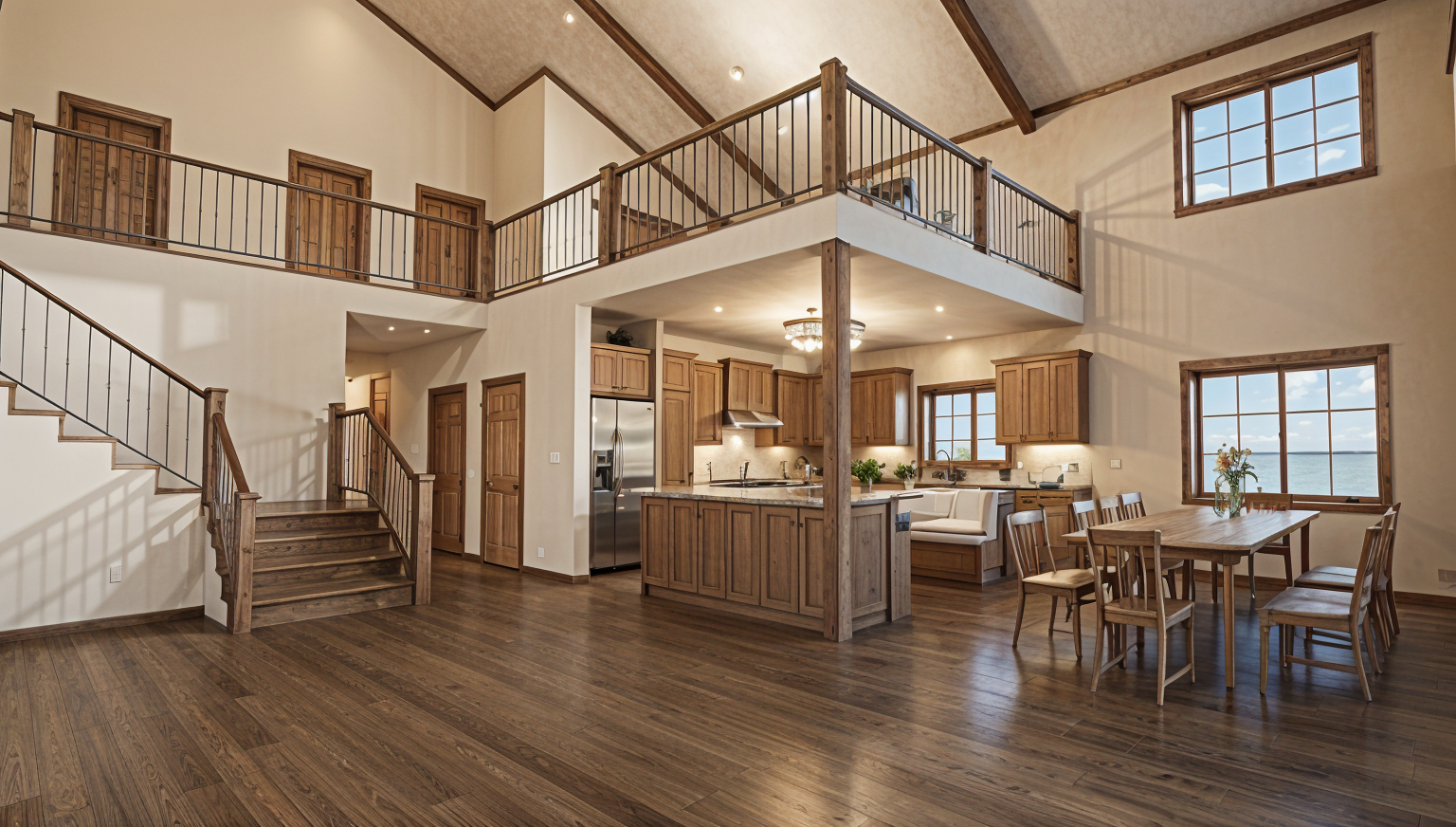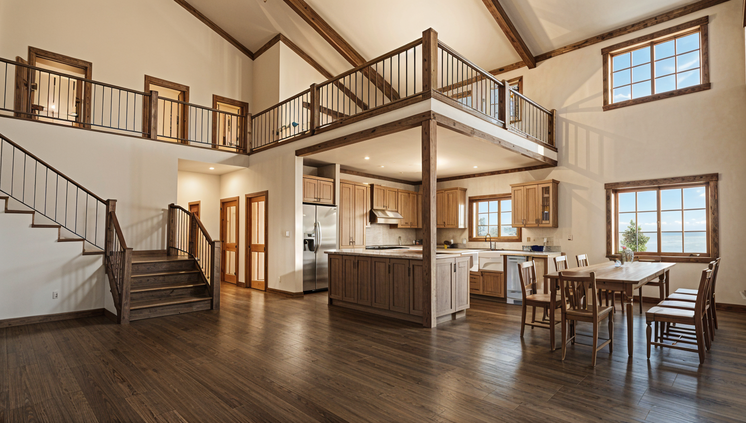 add rustic trim and lighting to this interior image render in hyper realistic photo image be consistent with trim keep ceiling beams as red iron beams maintain cabinet and breakfast seating area in kitchen island configuration as shown