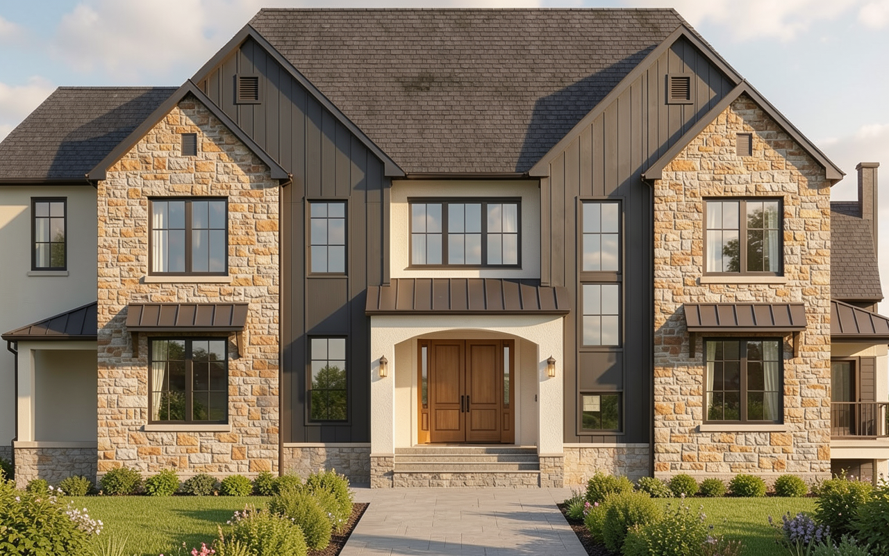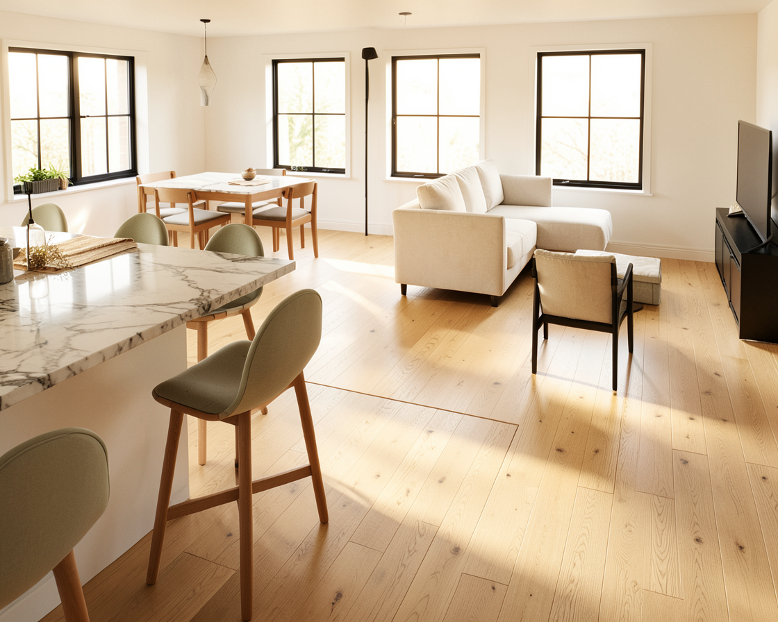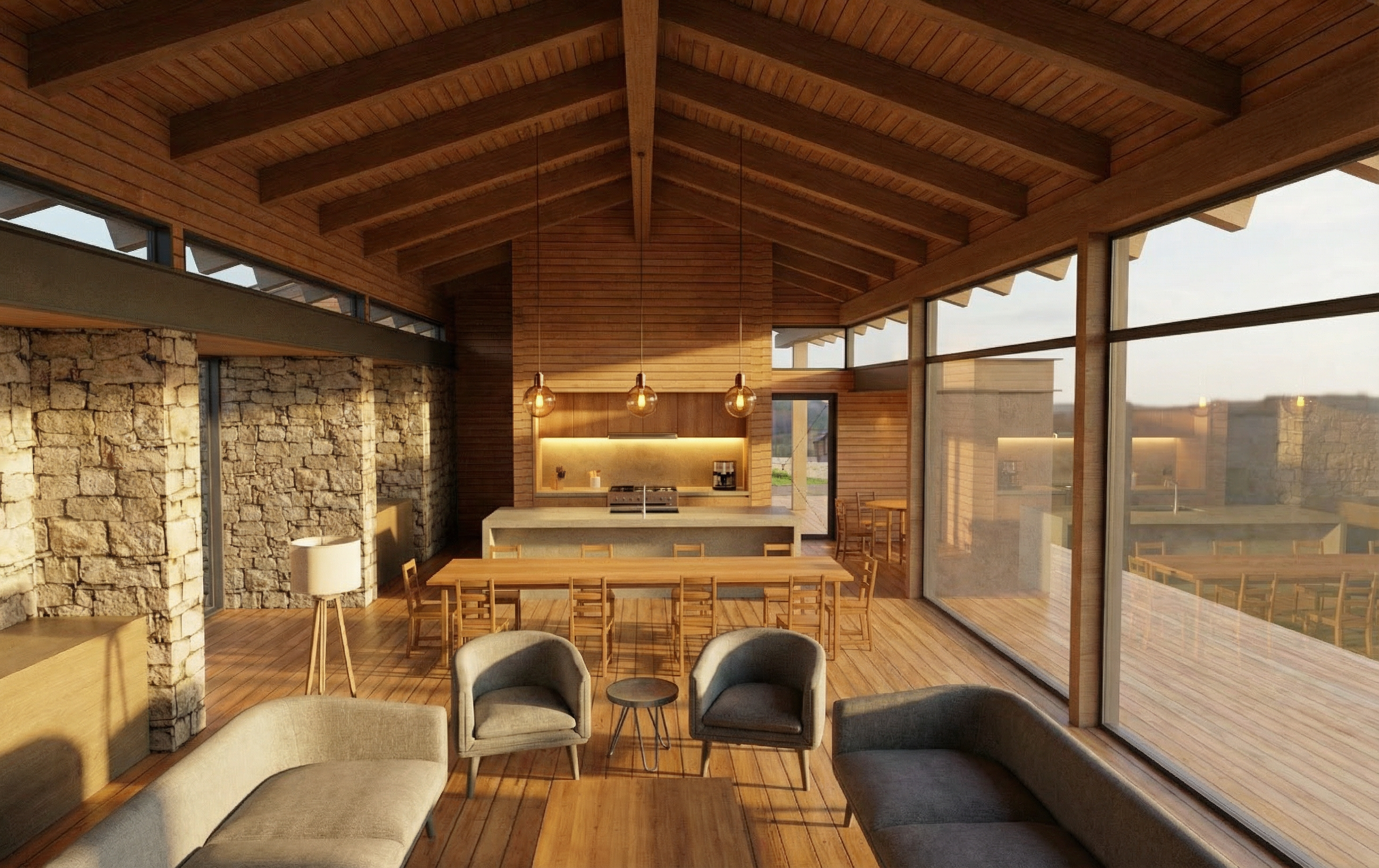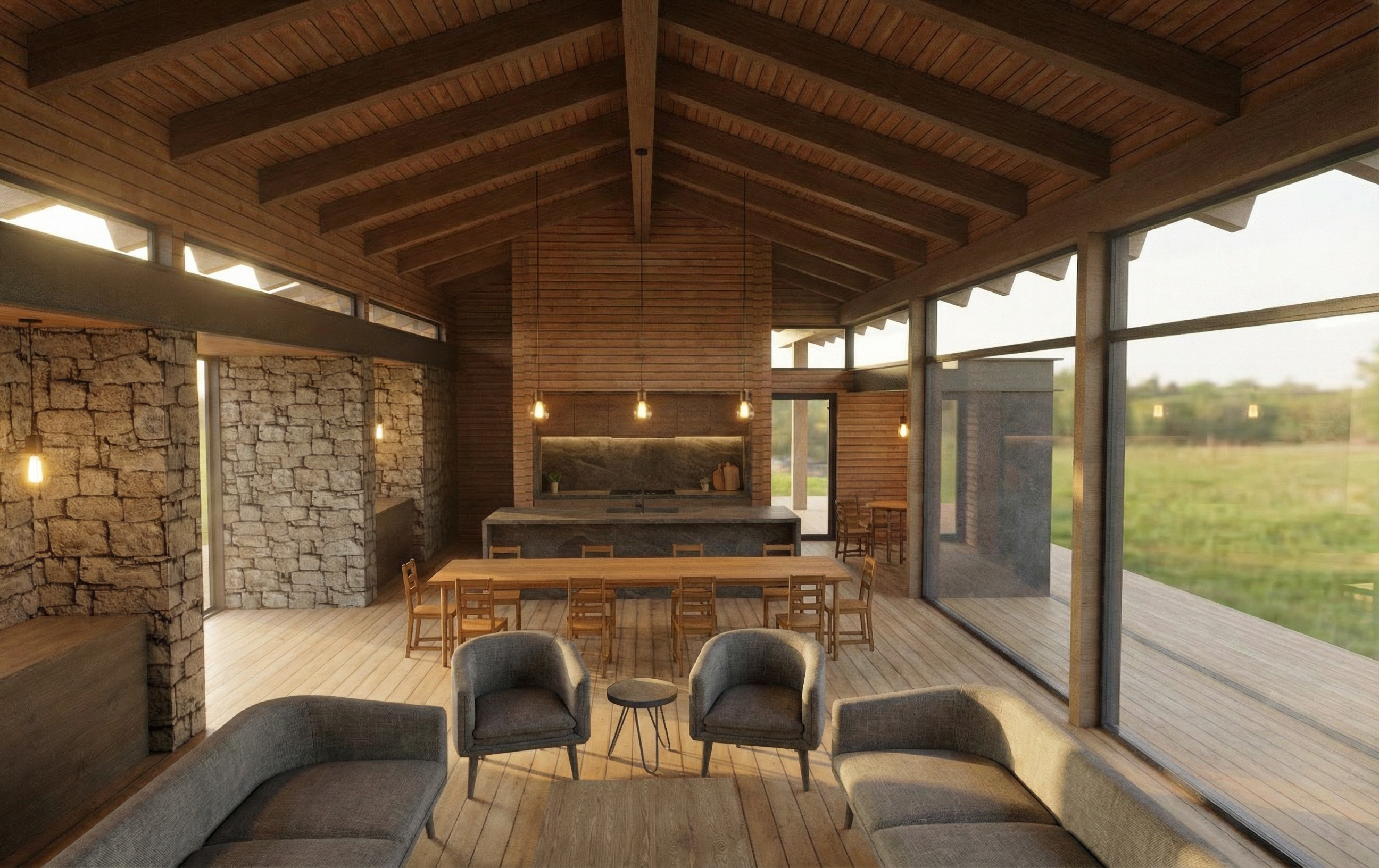 add rustic trim and lighting to this interior image render in hyper realistic photo image be consistent with trim keep ceiling beams as red iron beams maintain cabinet and breakfast seating area in kitchen island configuration as shown