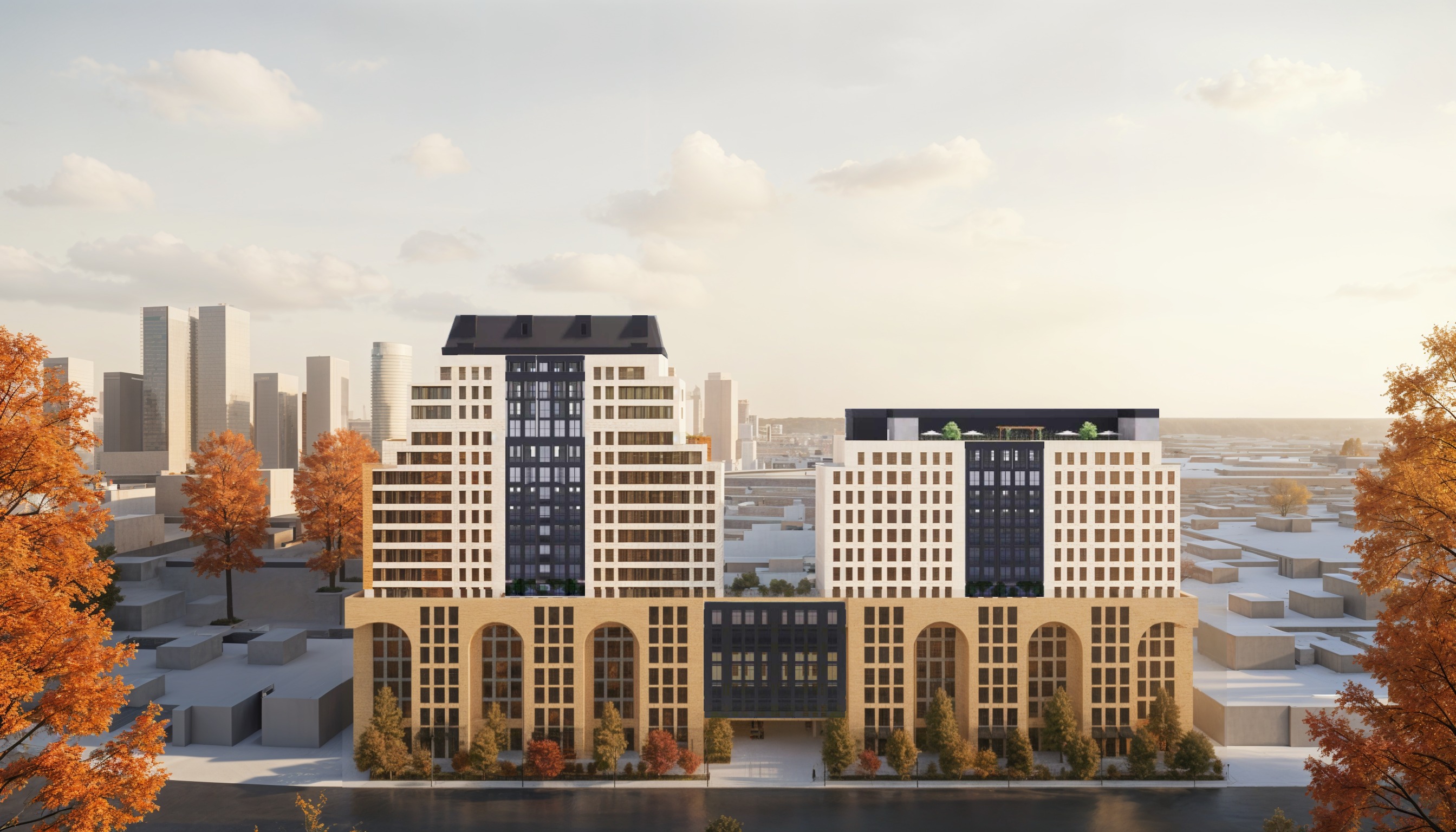 make this a more photo realistic scene with real building material finishes add cars on the road